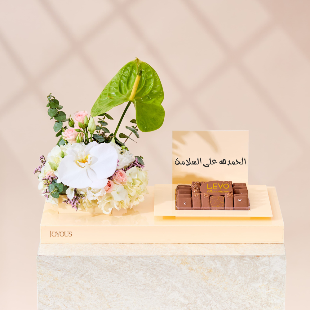 A bouquet that contains roses, orchid, anthurium and hydrangea along with chocolates.