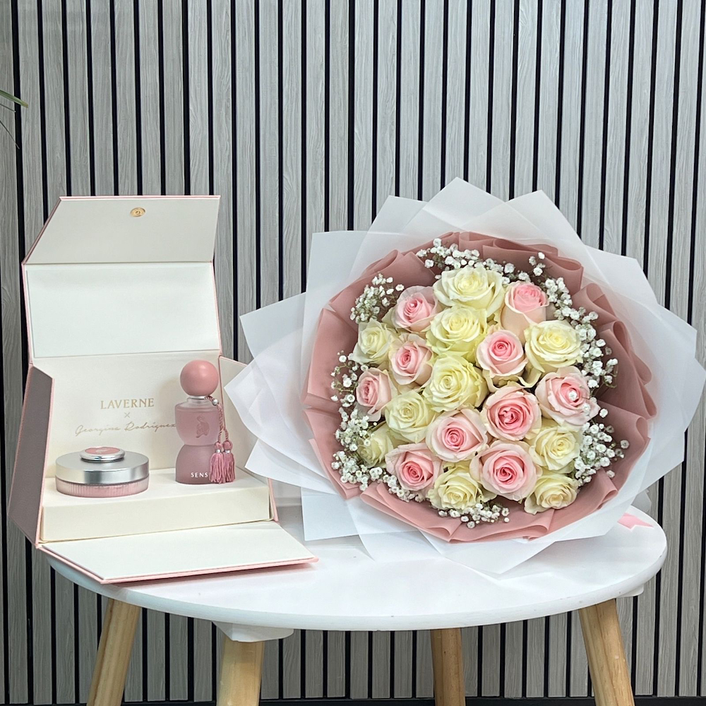A beautiful bouquet of white and pink roses, beautifully wrapped and arranged.