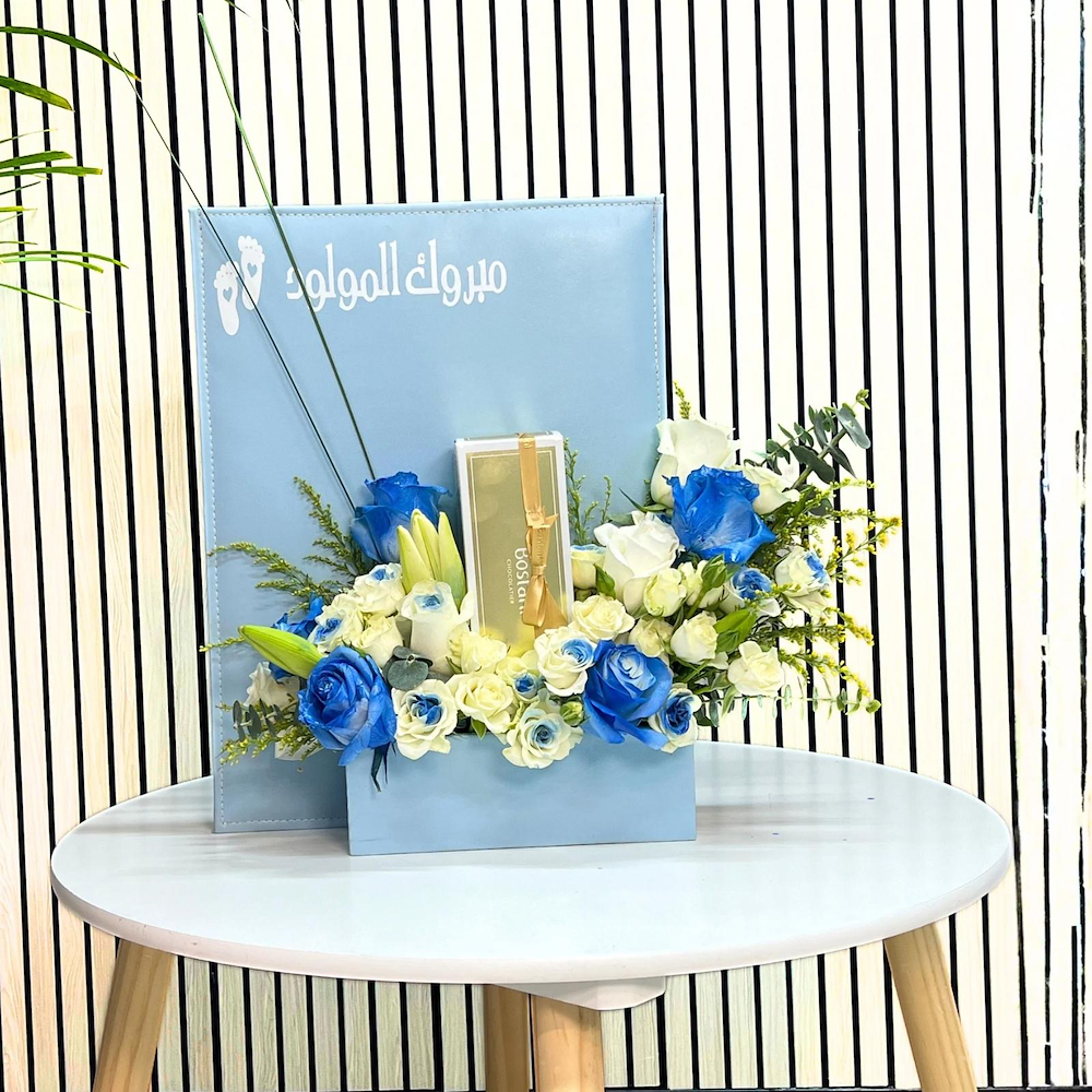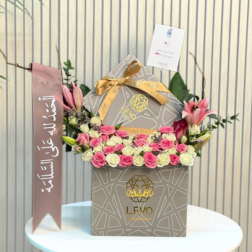 A bouquet containing pink and white baby roses, arranged beautifully in a box with a box of chocolates from Levo.