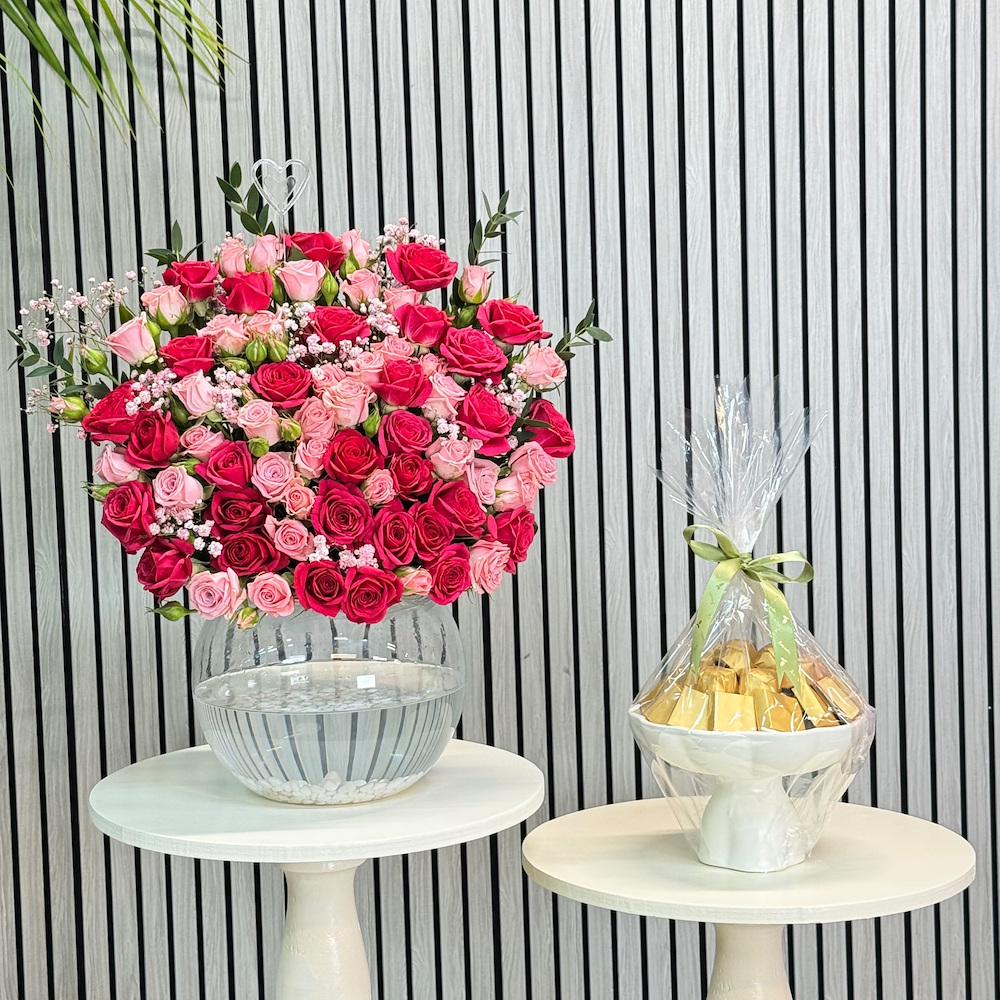 Glass flower vase with a fresh roses arrangement and Anoush chocolate (250 g) served in a tray, neatly wrapped and ready for delivery.