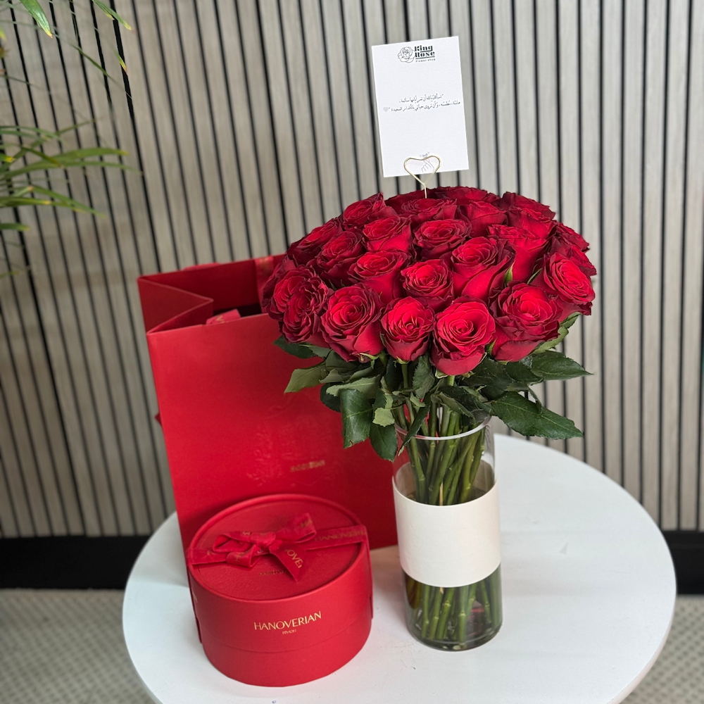 An elegant vase featuring red roses with 450g of Hanoverian chocolates.