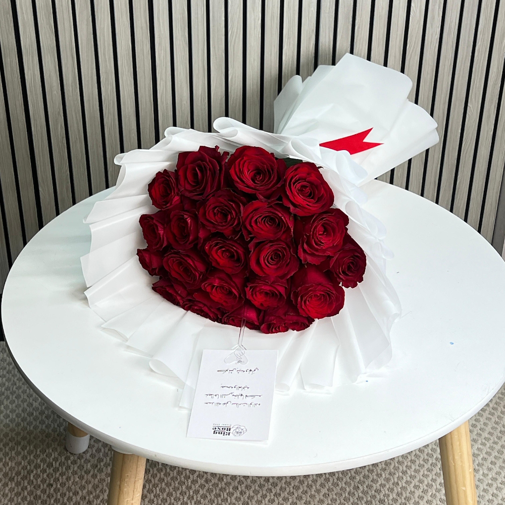 A luxury red roses bouquet with elegant white wrapping, arranged in a style.