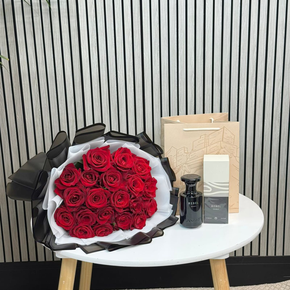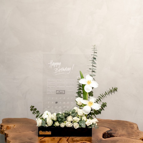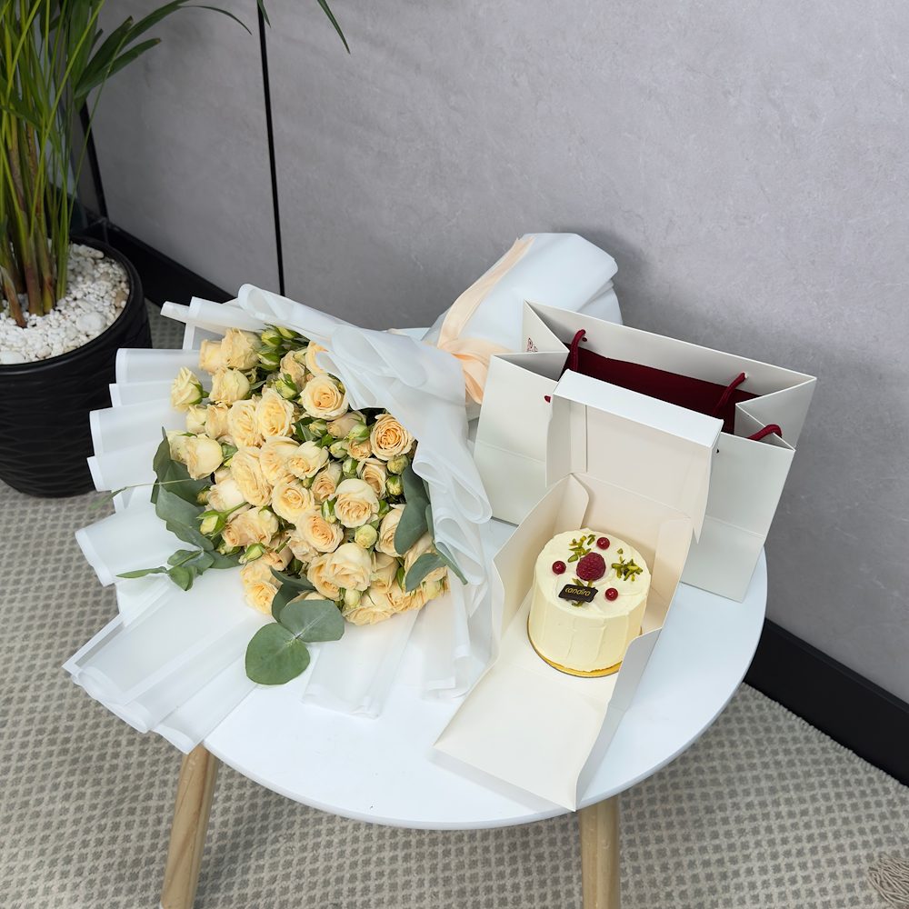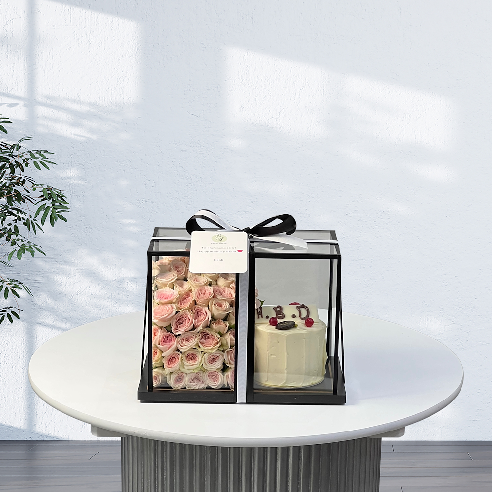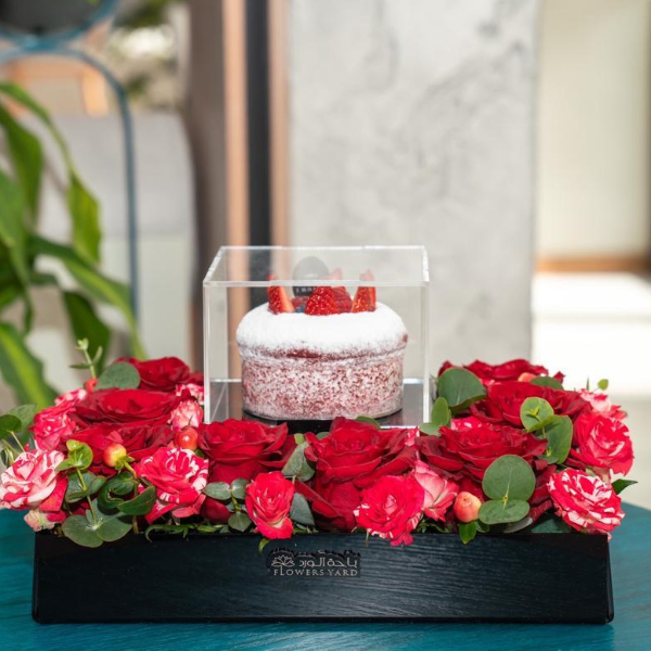 A black glass box contains roses and a small cake.