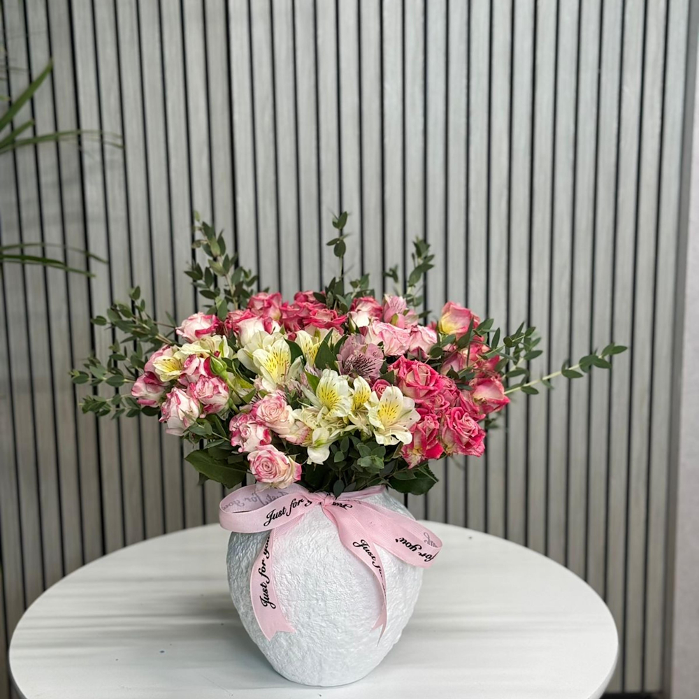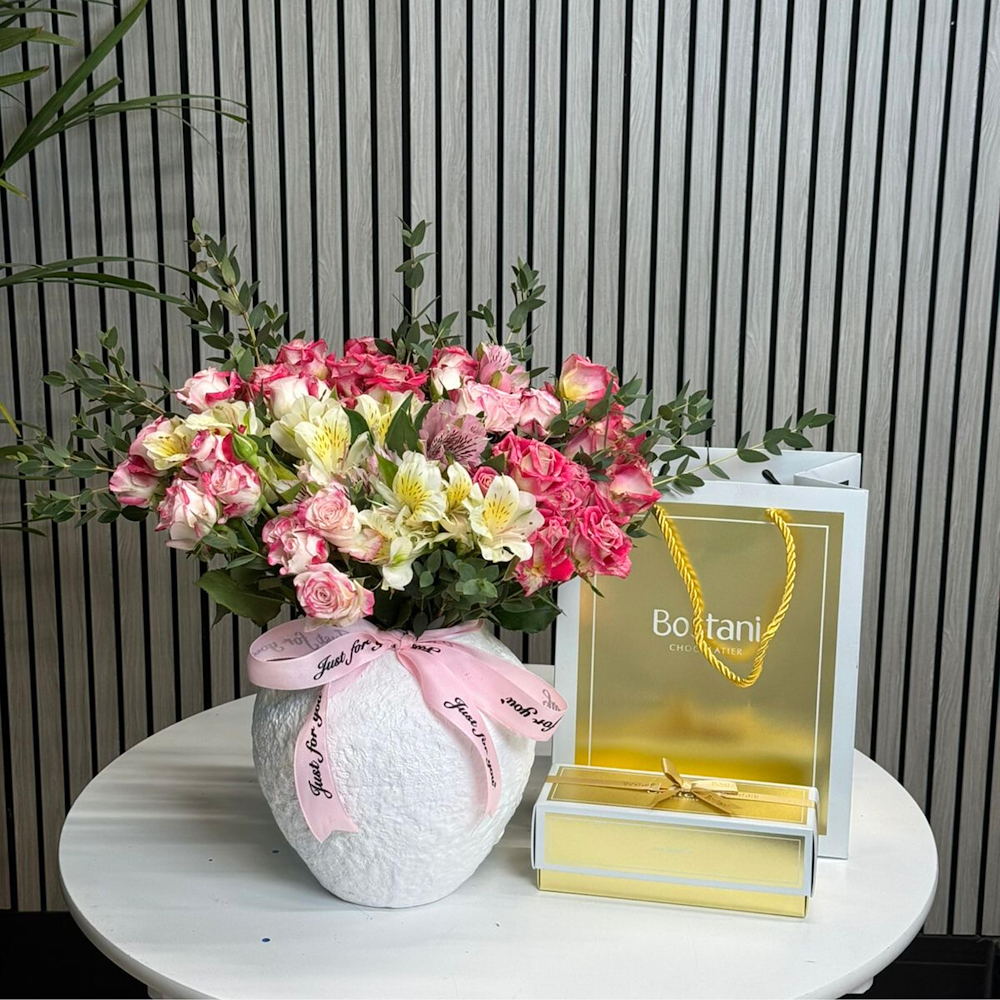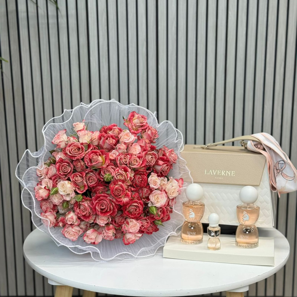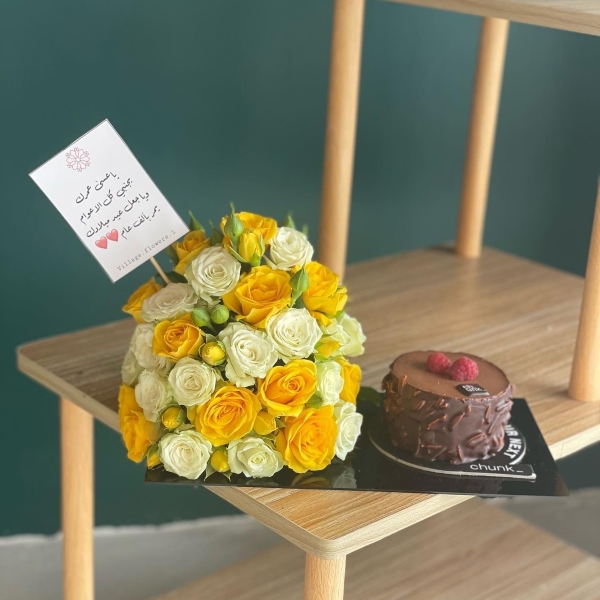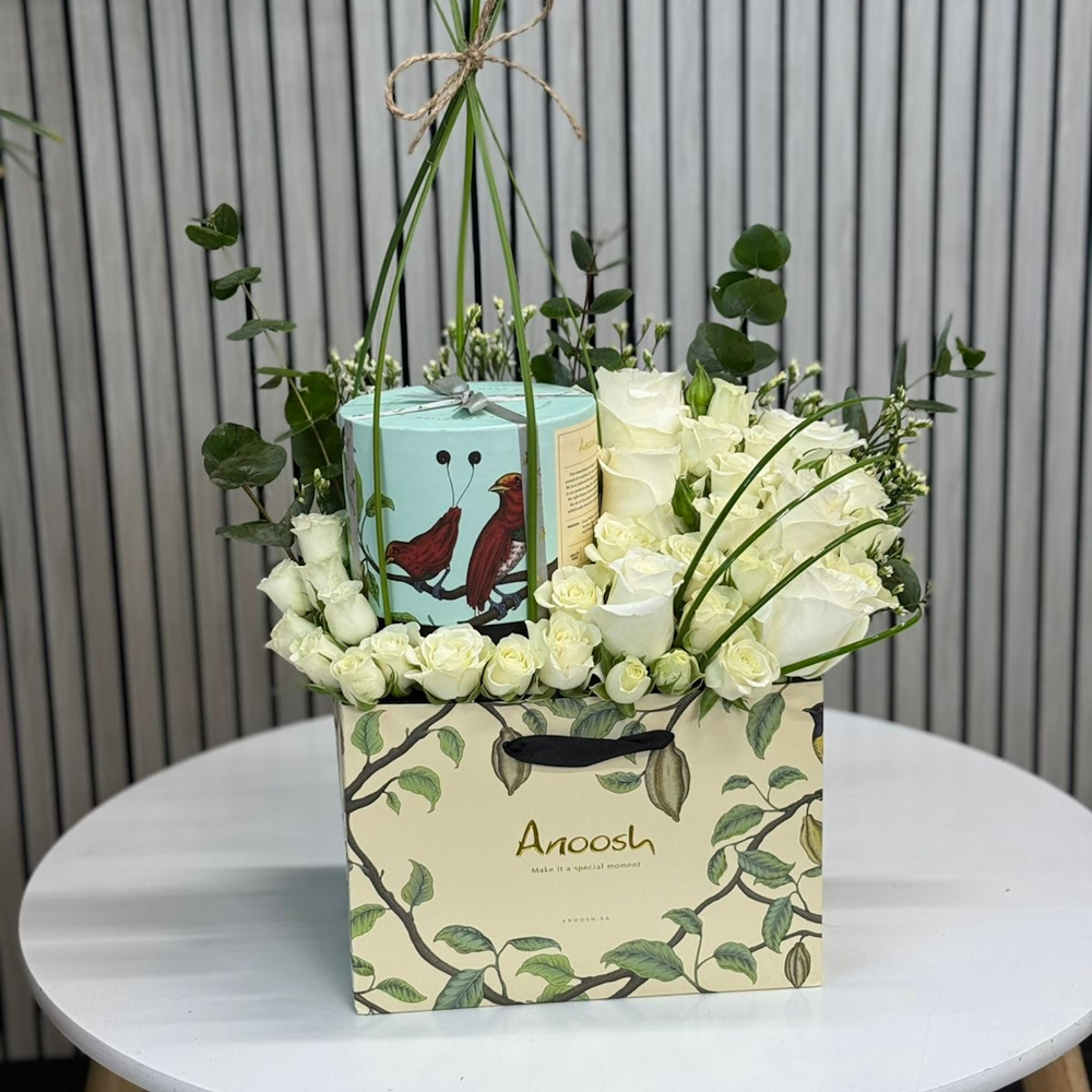 A black glass box contains roses and a small cake.