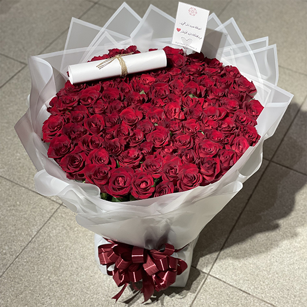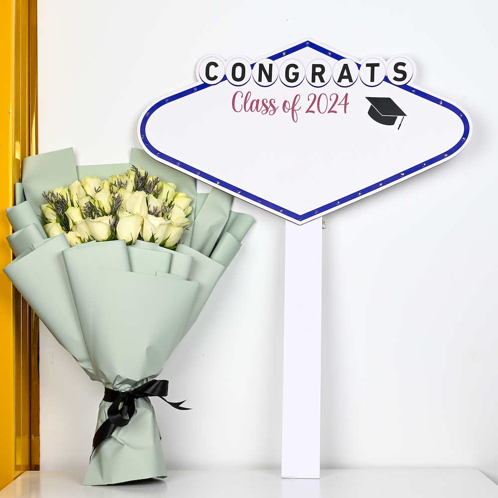 A hand bouquet which contains hydrangea, roses and eucalyptus with a graduation cap.