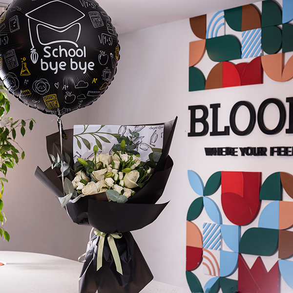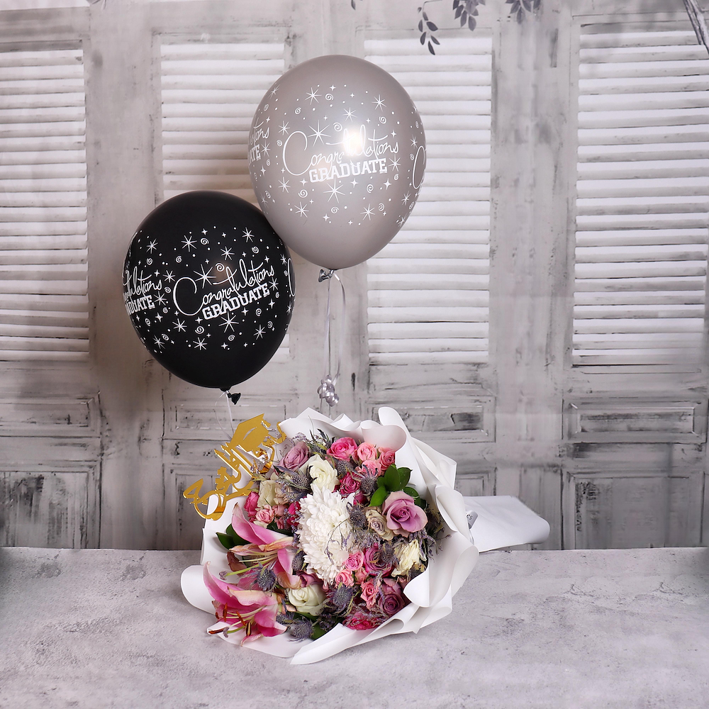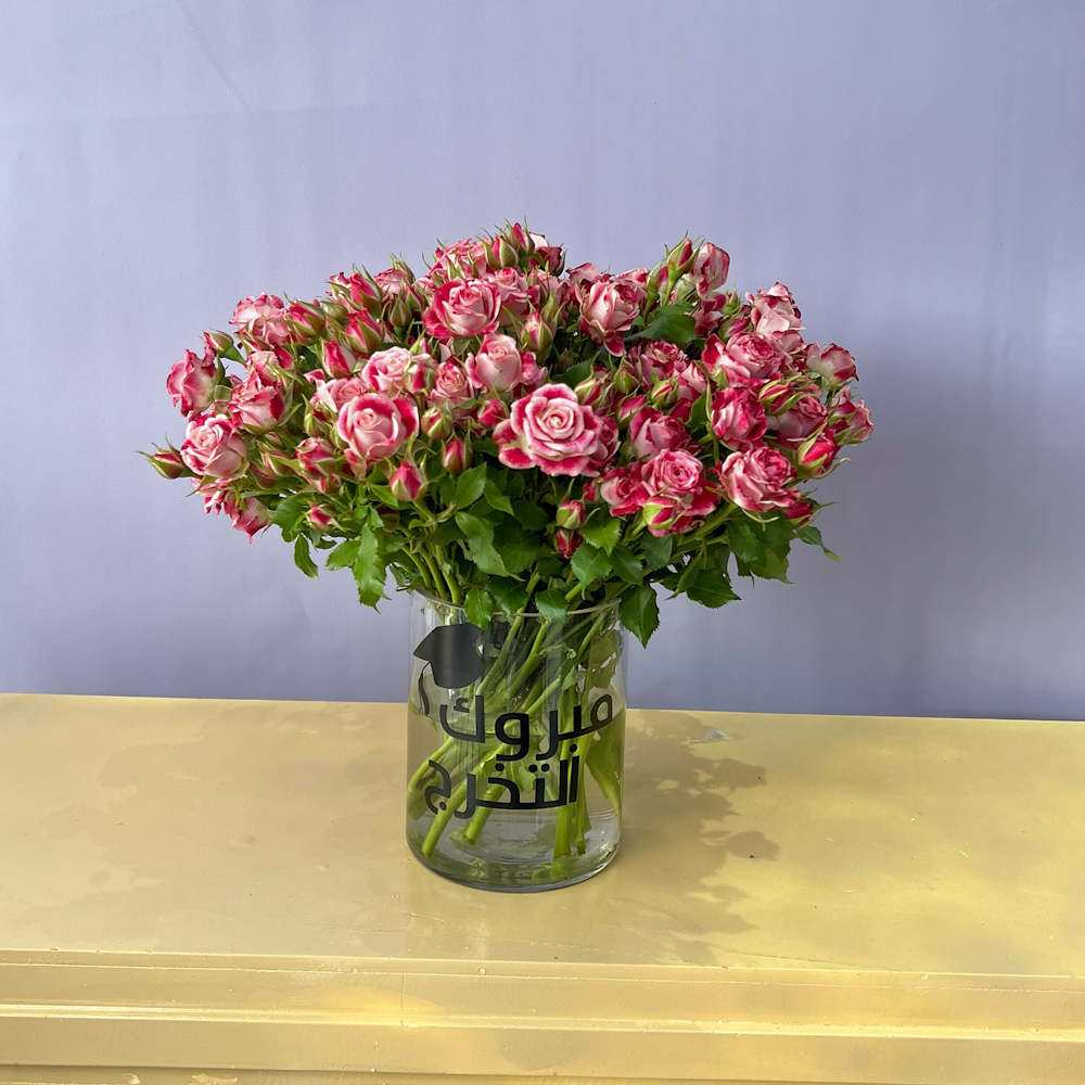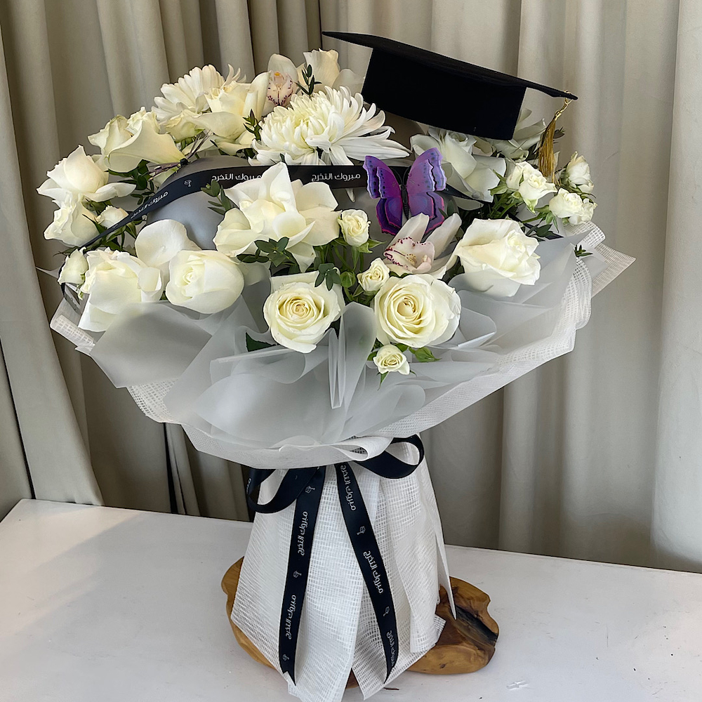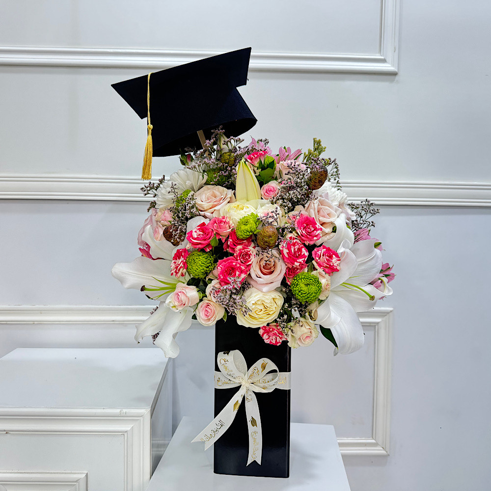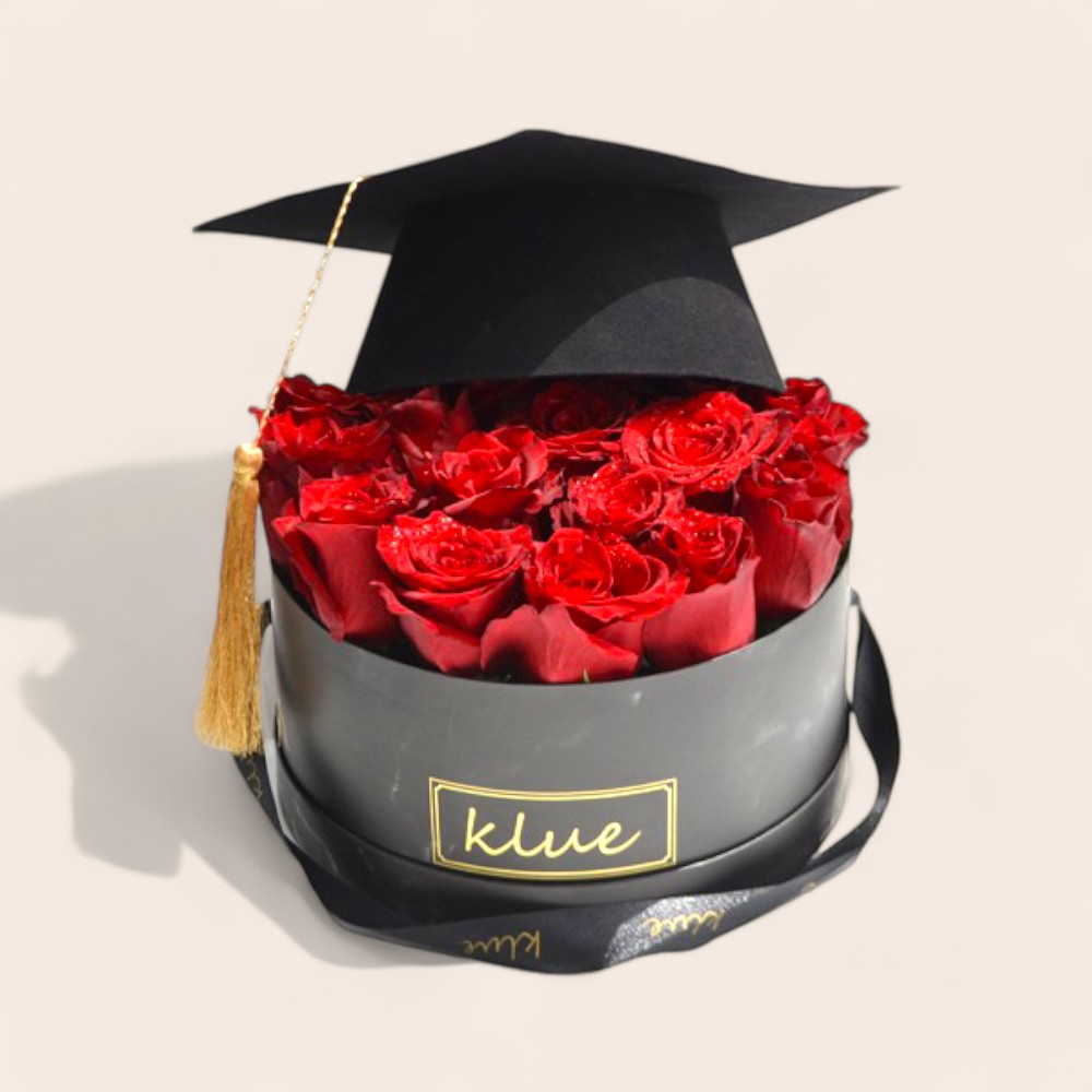 A box filled with red roses presented in a Klue luxurious box with a graduation cap.