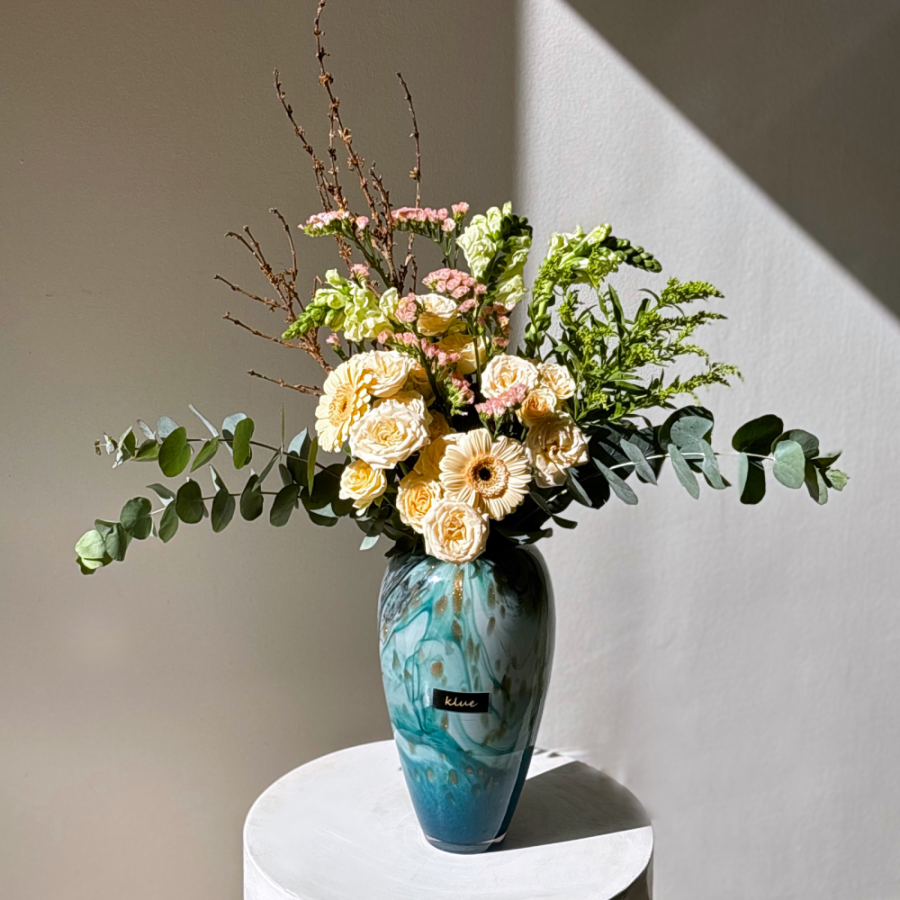A bouquet containing roses, gerberas, matthiola, and statice, arranged beautifully in a vase.