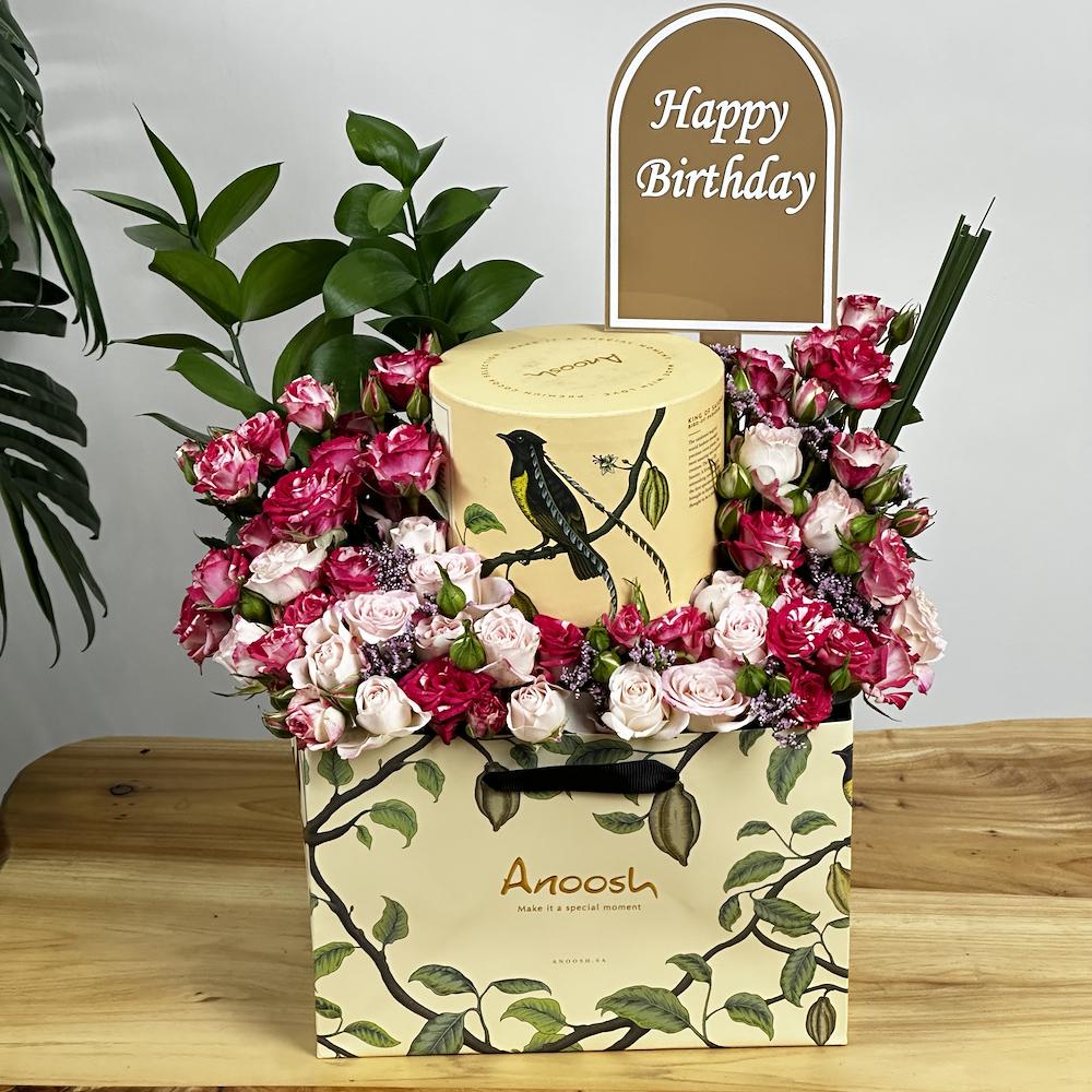 A box arranged with pink baby roses with 250g of Anoosh chocolates and an acrylic topper.