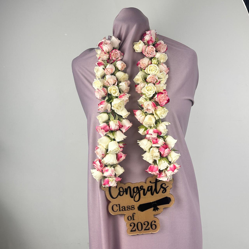A floral necklace filled with baby roses along with a Graduation topper.