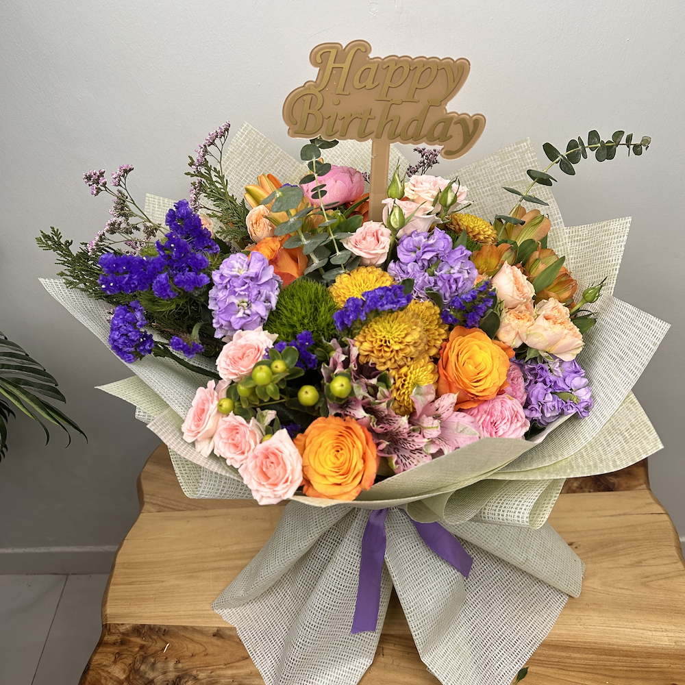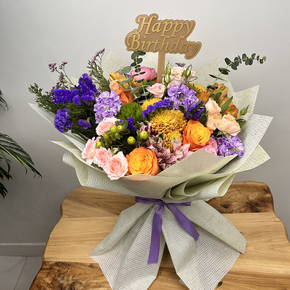 A bouquet arranged with the most beautiful Dutch flowers, orange, purple and pink roses, with an acrylic topper.