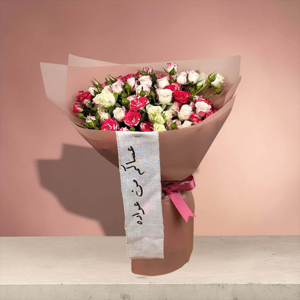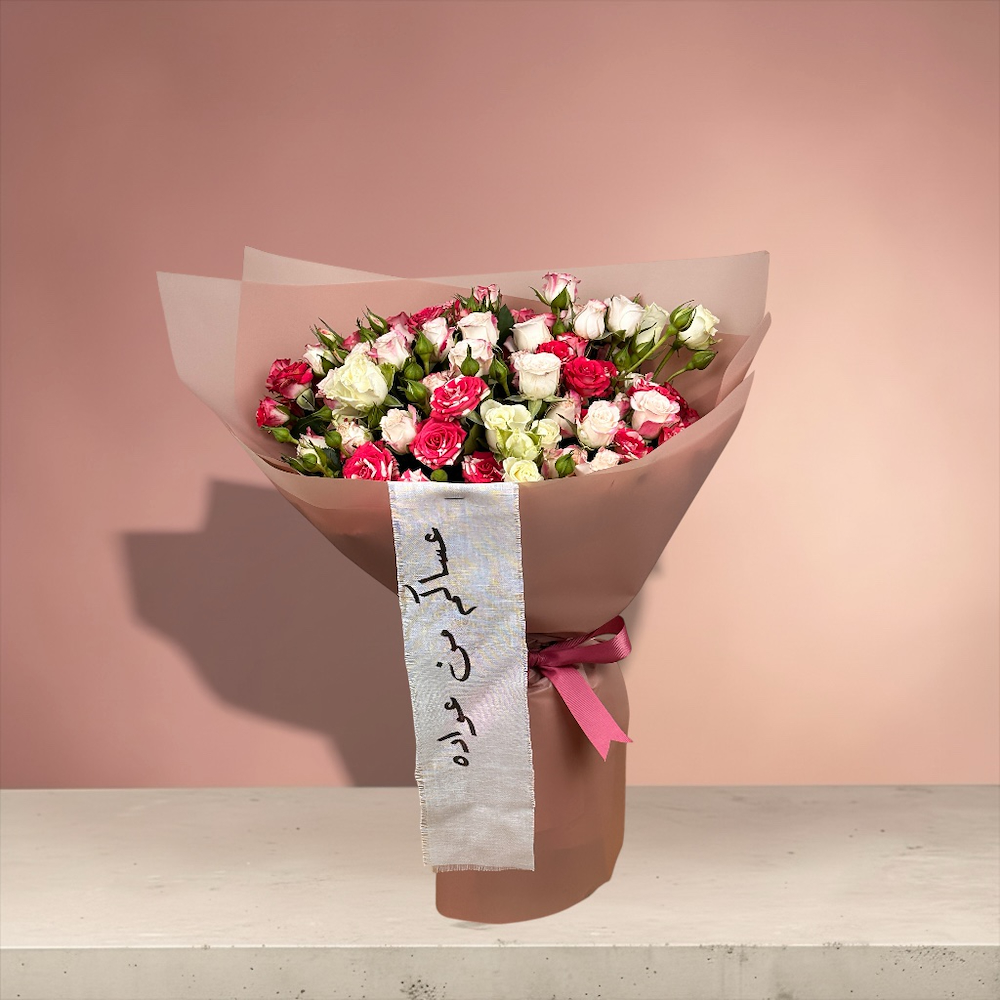 A bouquet arranged with natural flowers and a fabric ribbon, bearing the phrase "May you be among those who return to celebrate it again.".