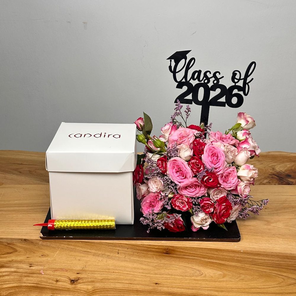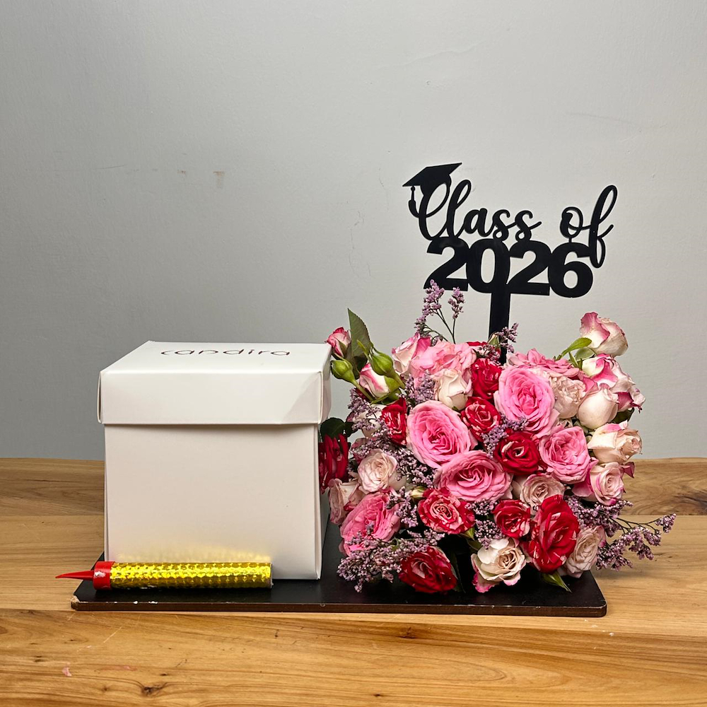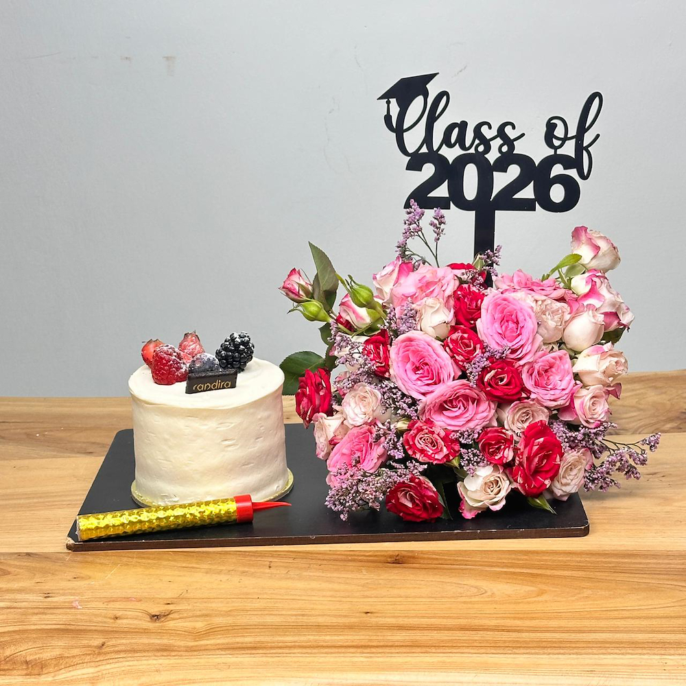 A bouquet that contains roses along with a cake from Candera and a Graduation topper.
