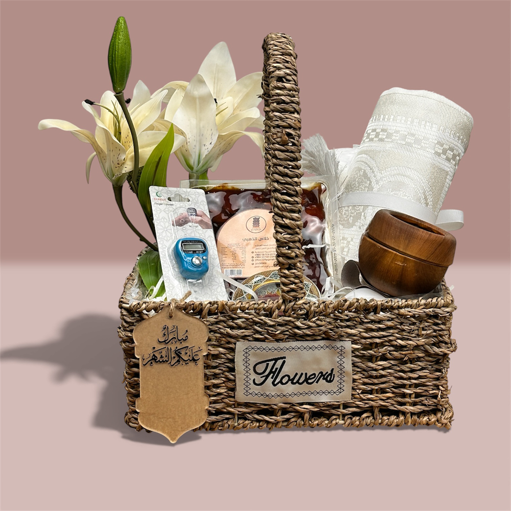 This bouquet contains lilies, 1 gram of saffron threads, a prayer rug, an incense burner, an acrylic tag, 0.5 kg of dates, and electronic prayer beads.