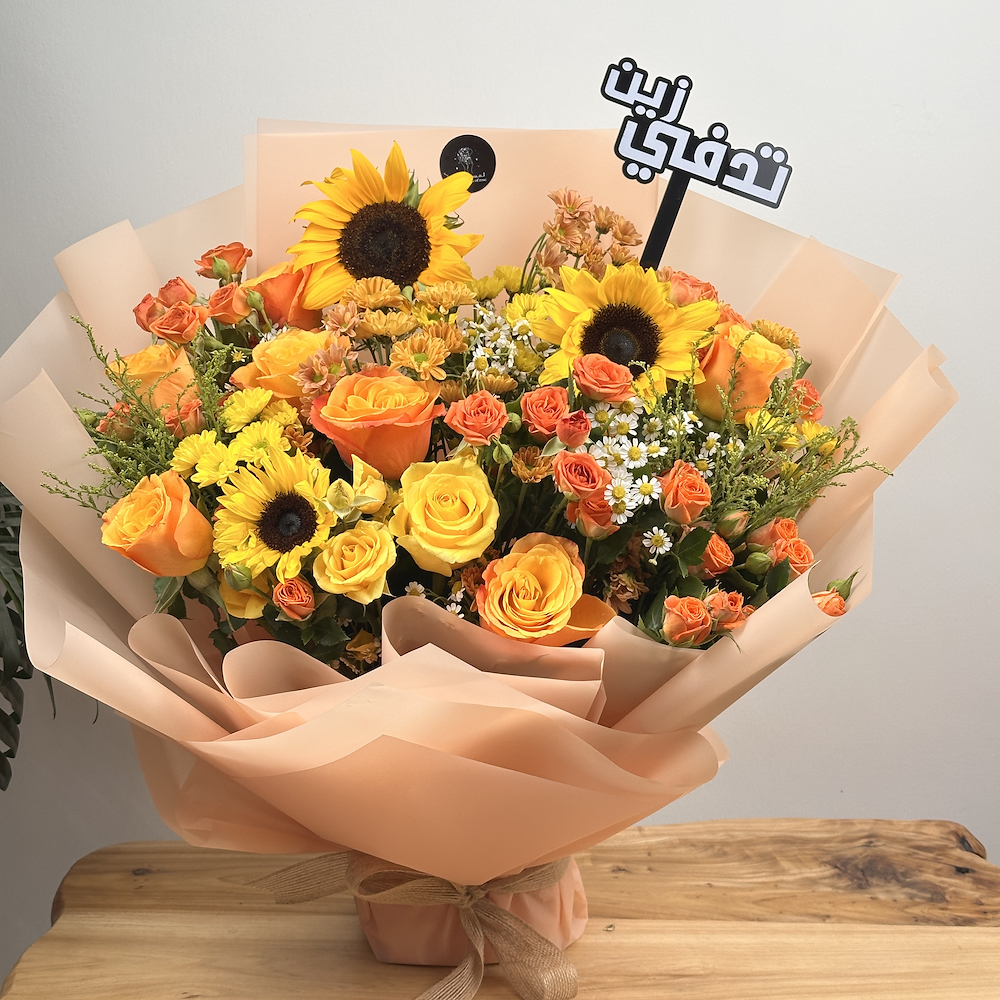 A bouquet of roses, baby roses, and sunflower's with an acrylic topper.