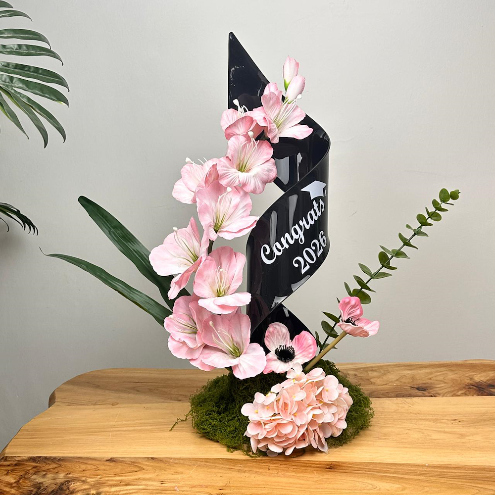 A wooden base featuring artificial roses with a natural texture, accented with the phrase “graduation”.