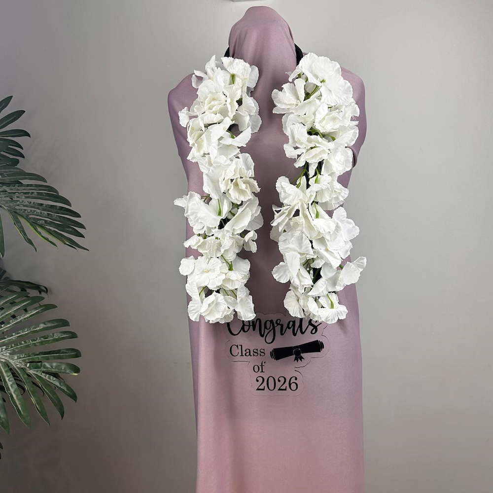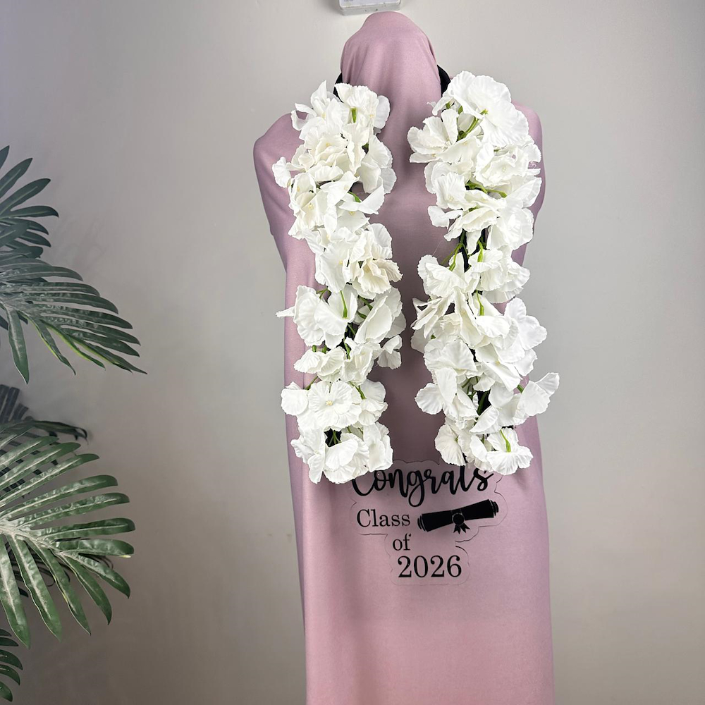 A graduation floral necklace filled with artificial flowers.