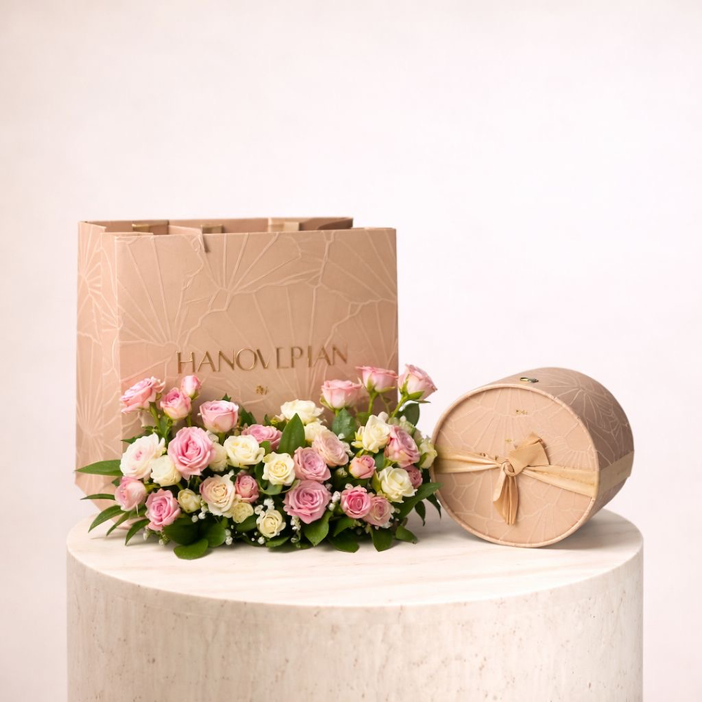 A bag featuring baby roses and Hanoverian chocolates. A bouquet that defines simplicity and class in every way.