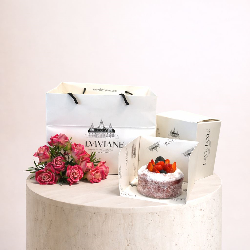 La Viviane cake, presented in a modern and elegant style with small red flowers.
