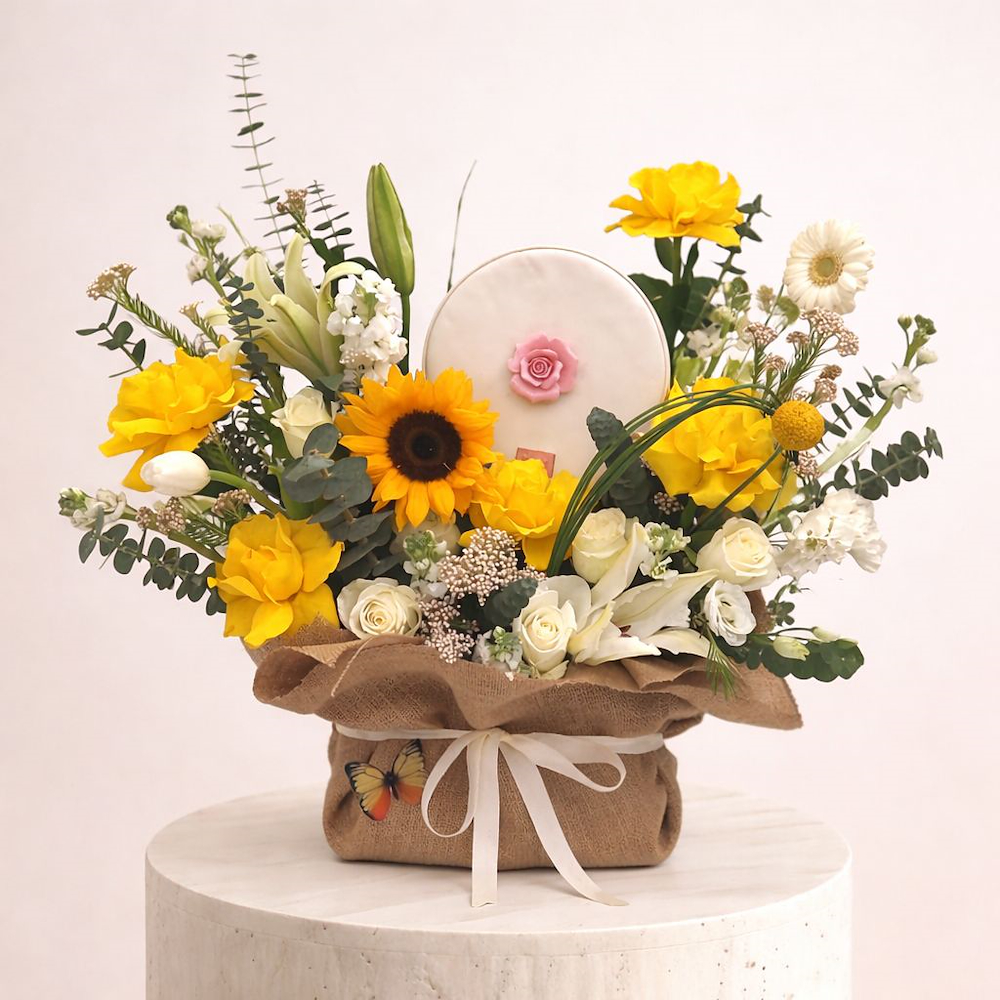 Floral arrangement with a touch of hospitality, this product combines the warmth of colors and presentation paper, as it is designed to be a piece of art that expresses joy and appreciation at the same time, as it combines distinctive roses and unique pieces of chocolates.