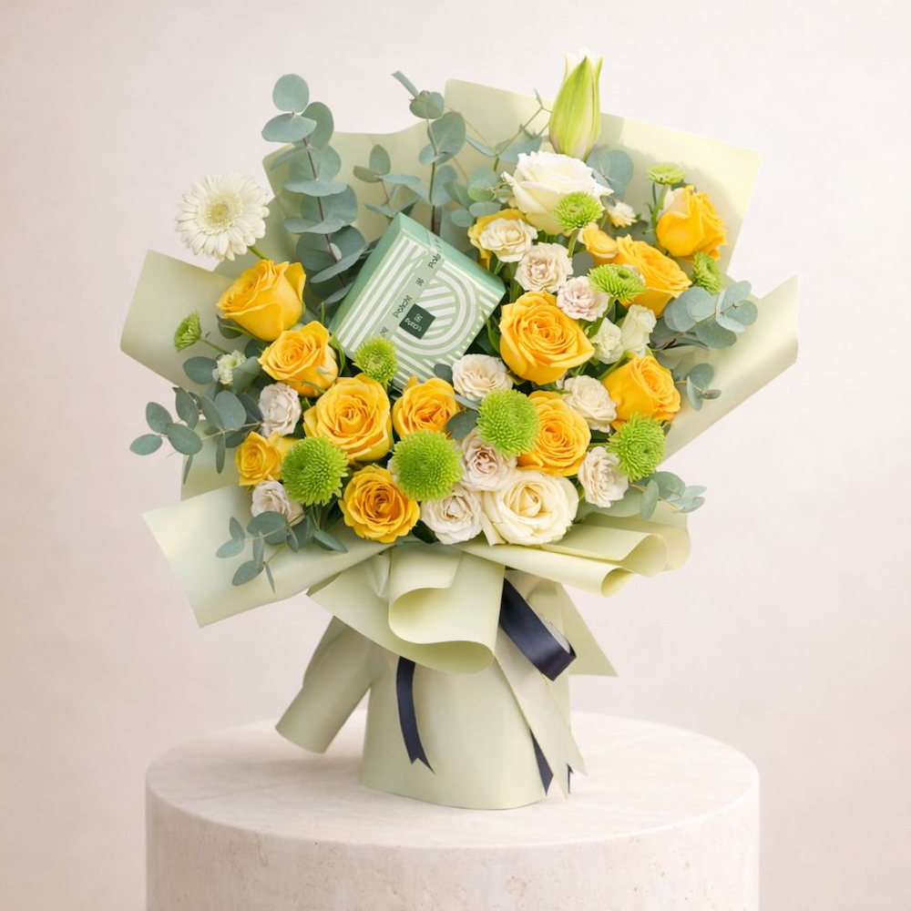 An elegant bouquet that pulsates with vitality and beauty, including a wonderful arrangement of bright yellow roses with soft white roses, harmonises with green touches of eucalyptus leaves to give it a refreshing and natural feeling. centered by a luxury chocolate box that adds a distinctive touch of luxury and pampering.
