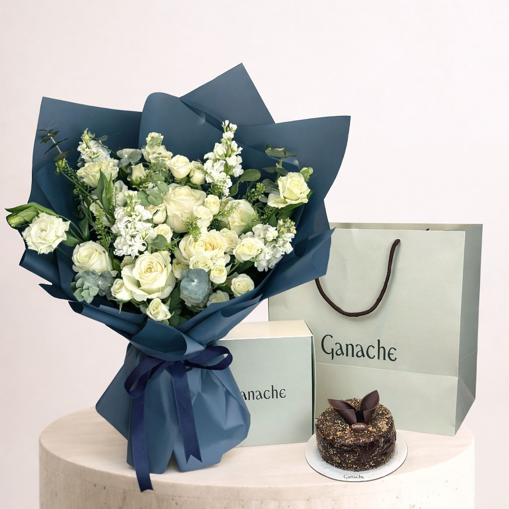 The meeting of luxury and high taste in one bouquet where the bright white flowers stand out like pearls in the middle of a dark royal navy shell, creating a visual contrast that captivates the senses. we were not satisfied with the beauty of the view, but added a touch of happiness and rich taste with the presence of the luxurious chocolate cake from Ganache.