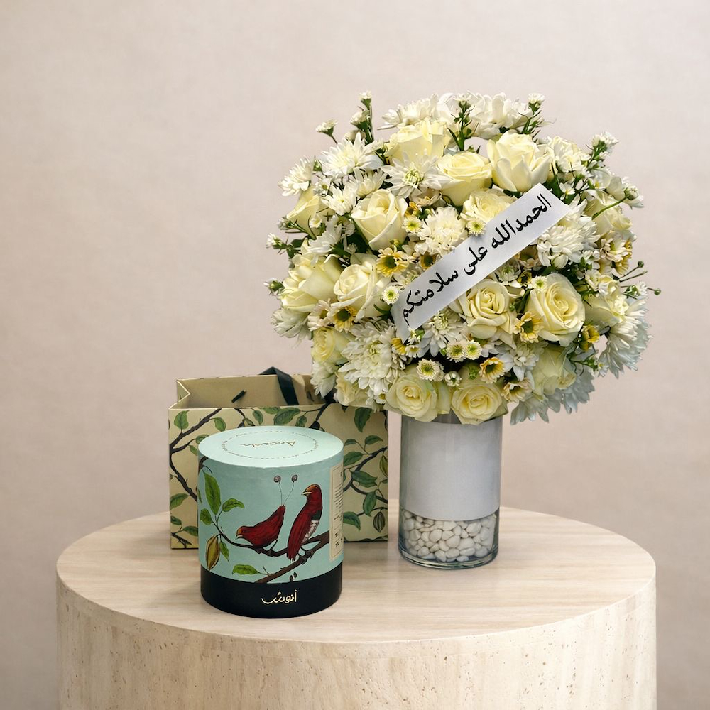 This coordination of flowers combines purity and joy, which makes it very suitable as a gift of "Thank God for your safety" or wishes for recovery, It also contains a box of delicious anosh wafer chocolates.