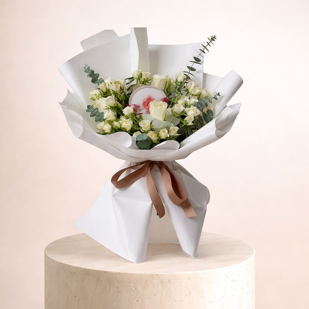 An elegant bouquet featuring white roses and baby roses with Bostani chocolates.