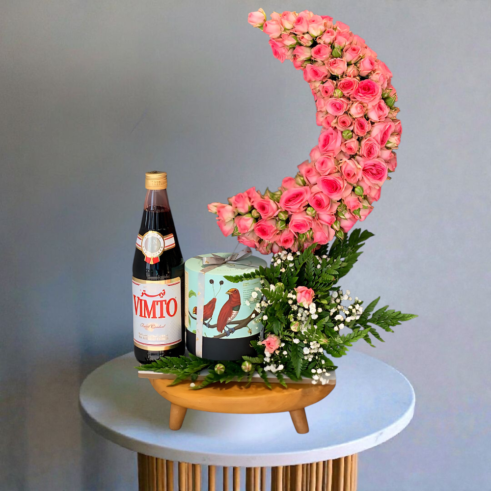 A crescent moon arrangement from baby roses and gypsophila, paired with a small box of Anoush chocolates and a bottle of Vimto for a charming touch.