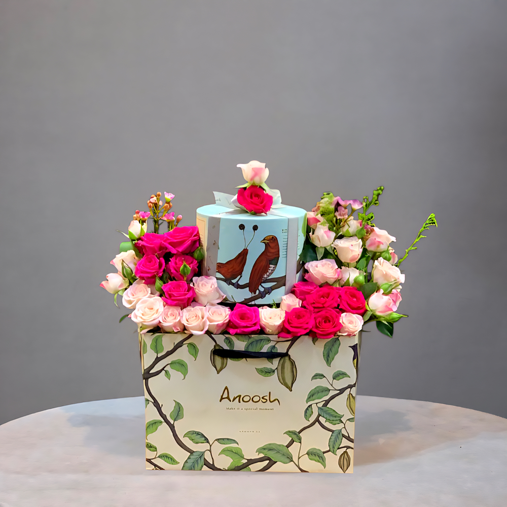 A bag filled with baby roses and Anoosh chocolates.