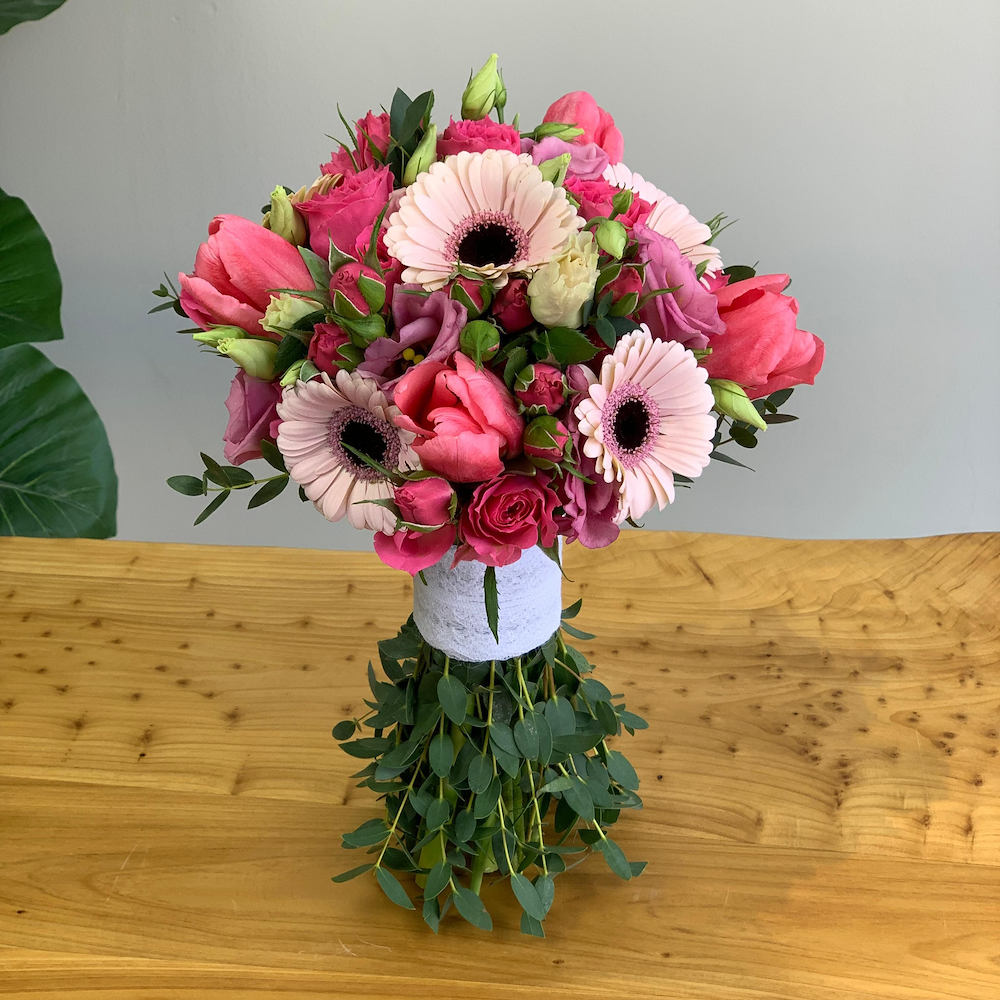 An elegant, luxurious large bouquet featuring baby rose, gerbera, chrysanthemum, and wax flowers with eucalyptus leaves, creating a rich and impressive look.