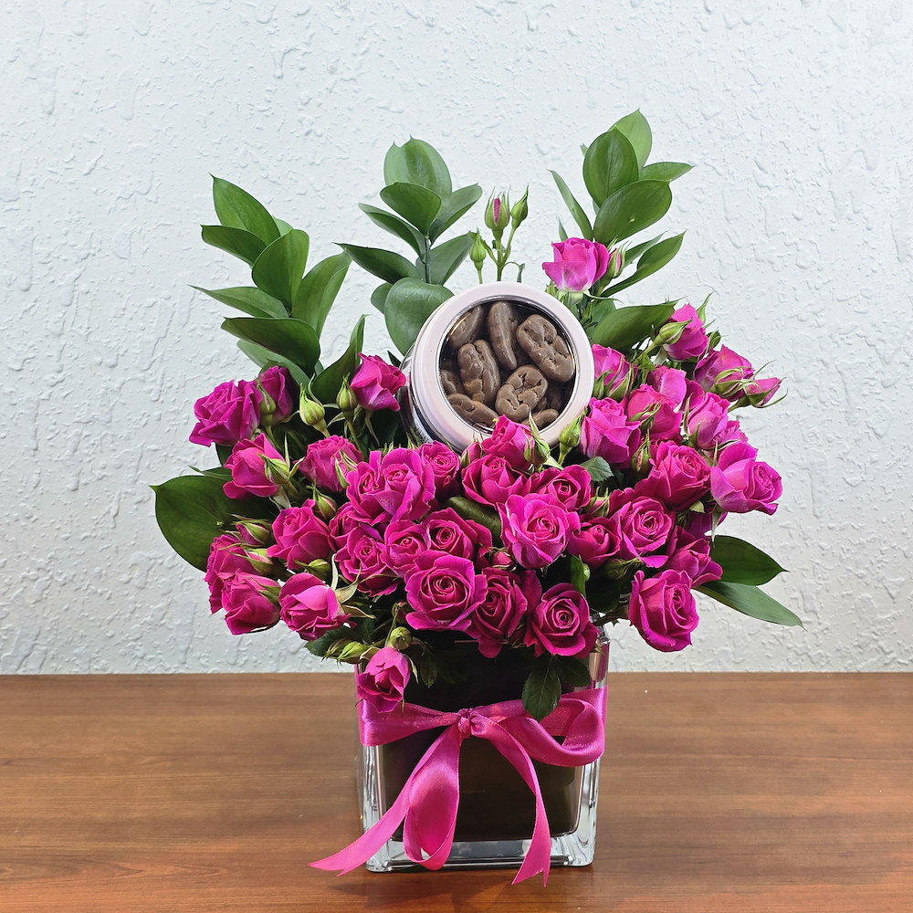 An elegant vase filled with baby roses with Bostani chocolates.