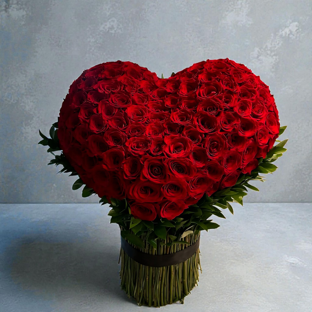 The heart of love is adorned with over 100 carefully arranged roses.