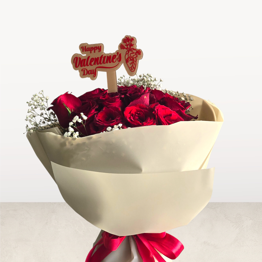 A hand bouquet of roses and gypsophila. A simple yet impactful arrangement to express love in the best way.