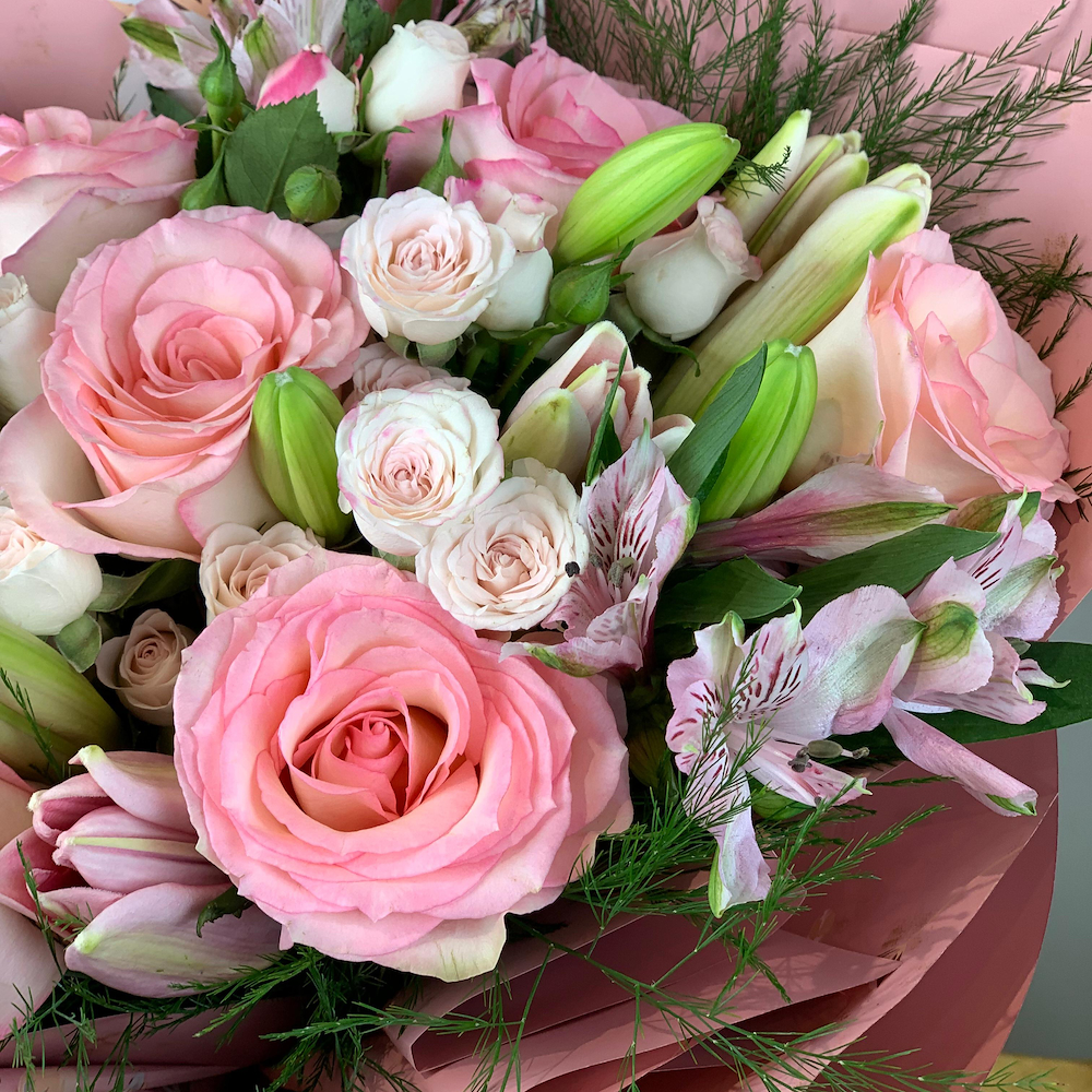 A luxurious bouquet filled with Dutch roses and baby roses, with elegant wrapping and a small cake.