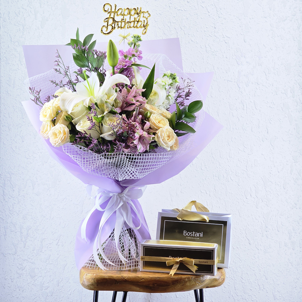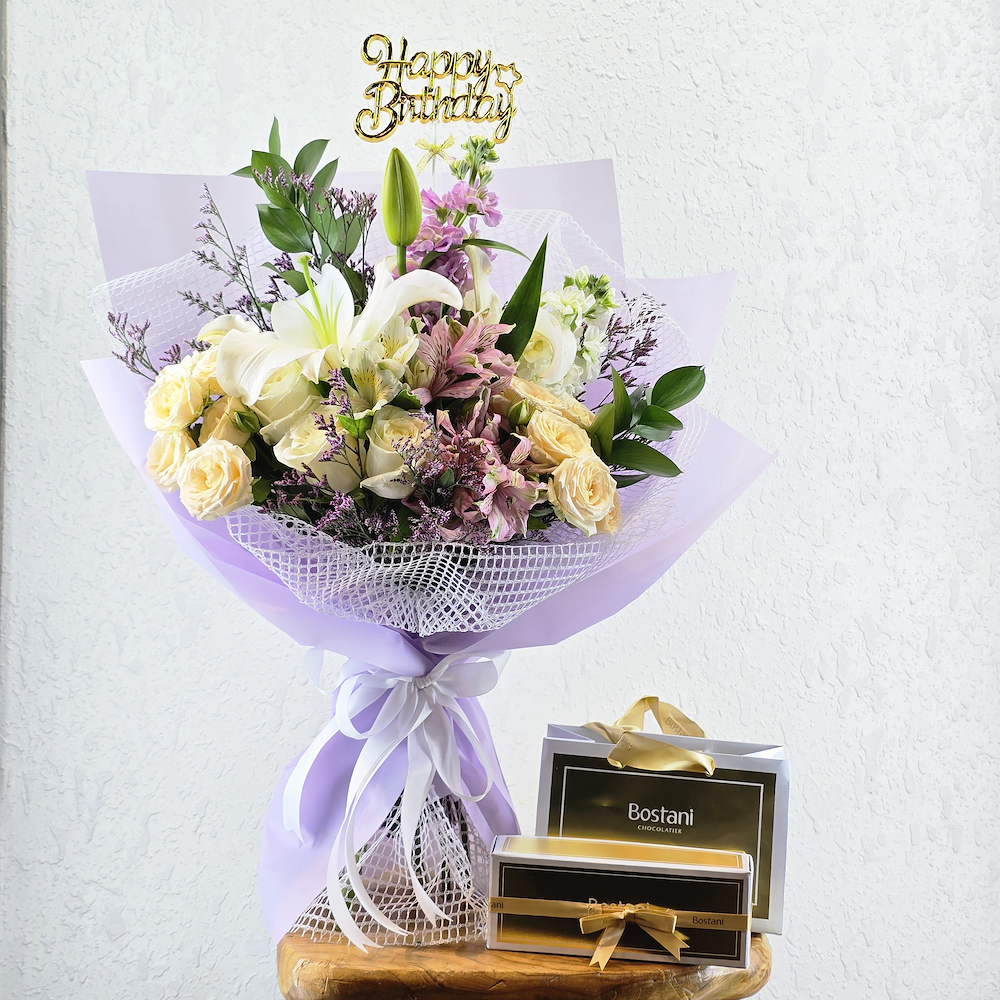 A bouquet that contains roses, alstroemerias, lilies and matthiola along with Bostani chocolates.