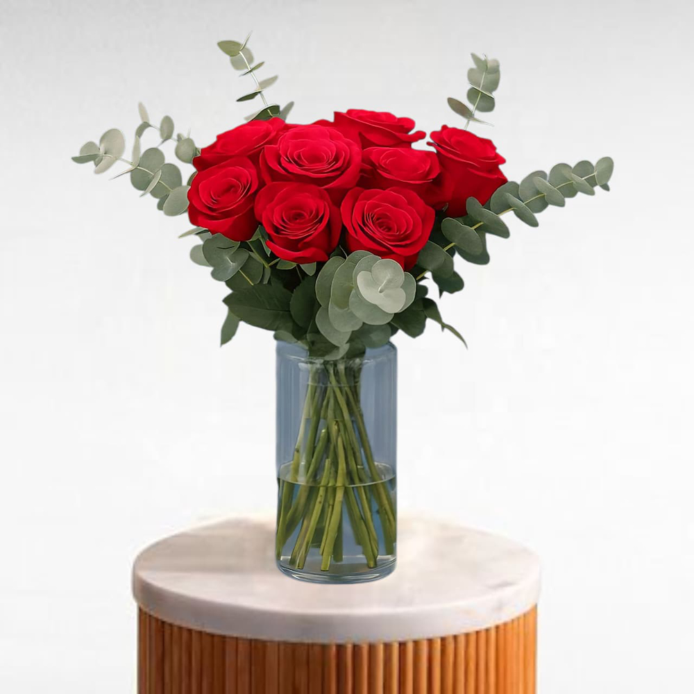A bouquet containing red roses, arranged beautifully in a vase. A simple yet powerful arrangement to express love the right way.