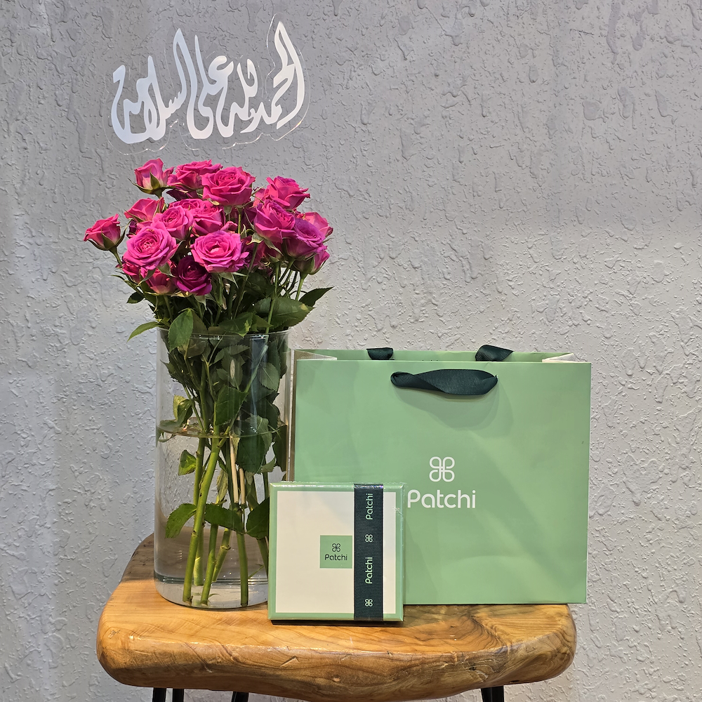 Pink baby roses vase with Patchi chocolates.