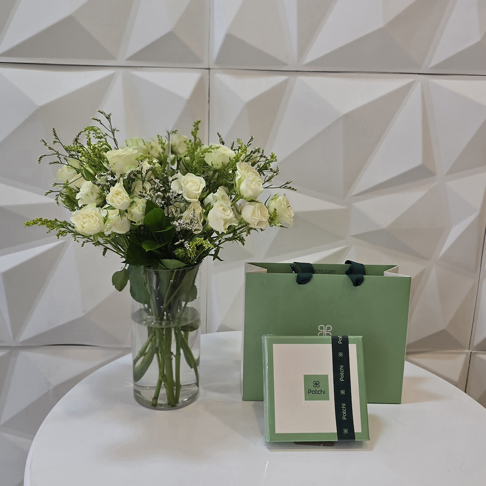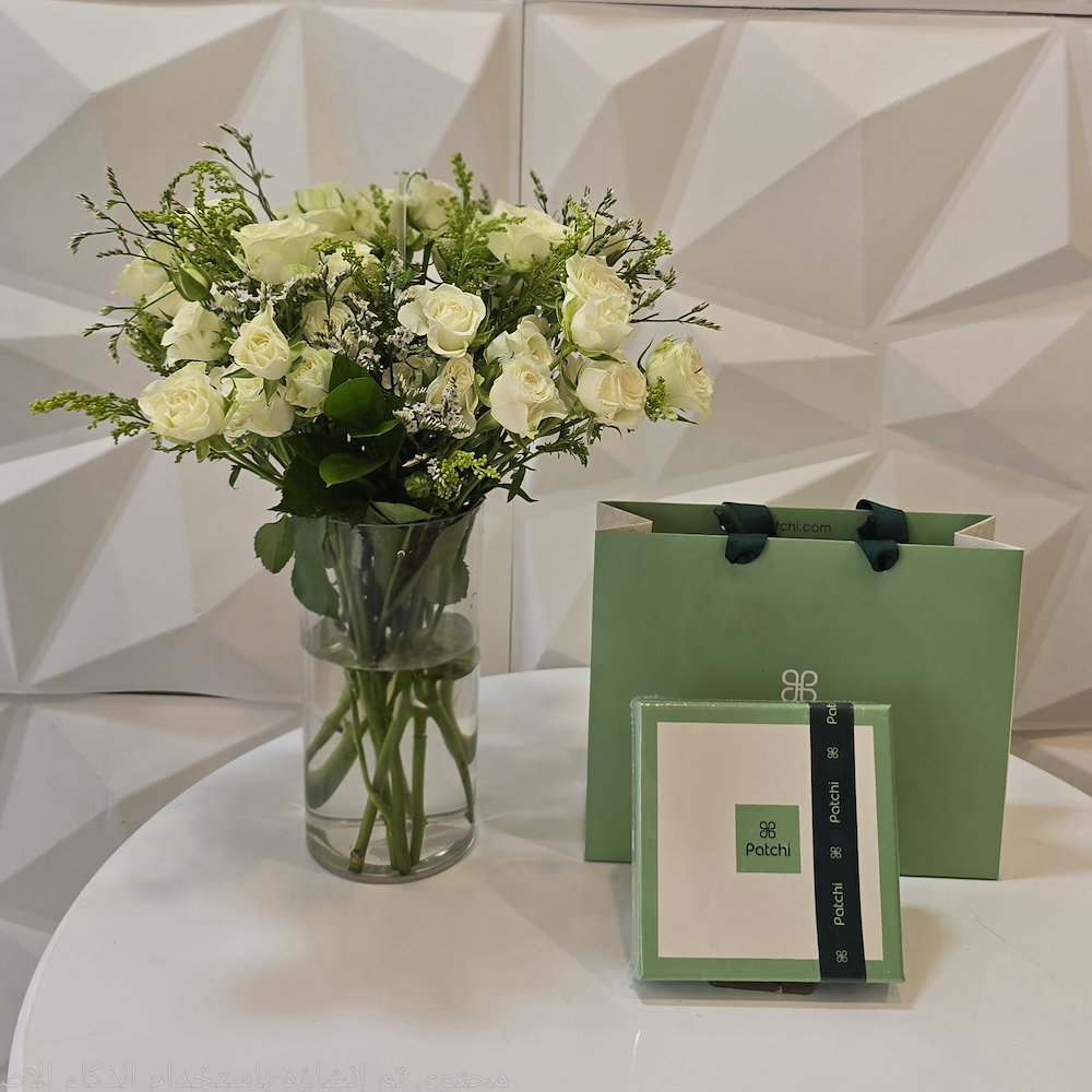 White baby roses in a vase with Patchi chocolates.