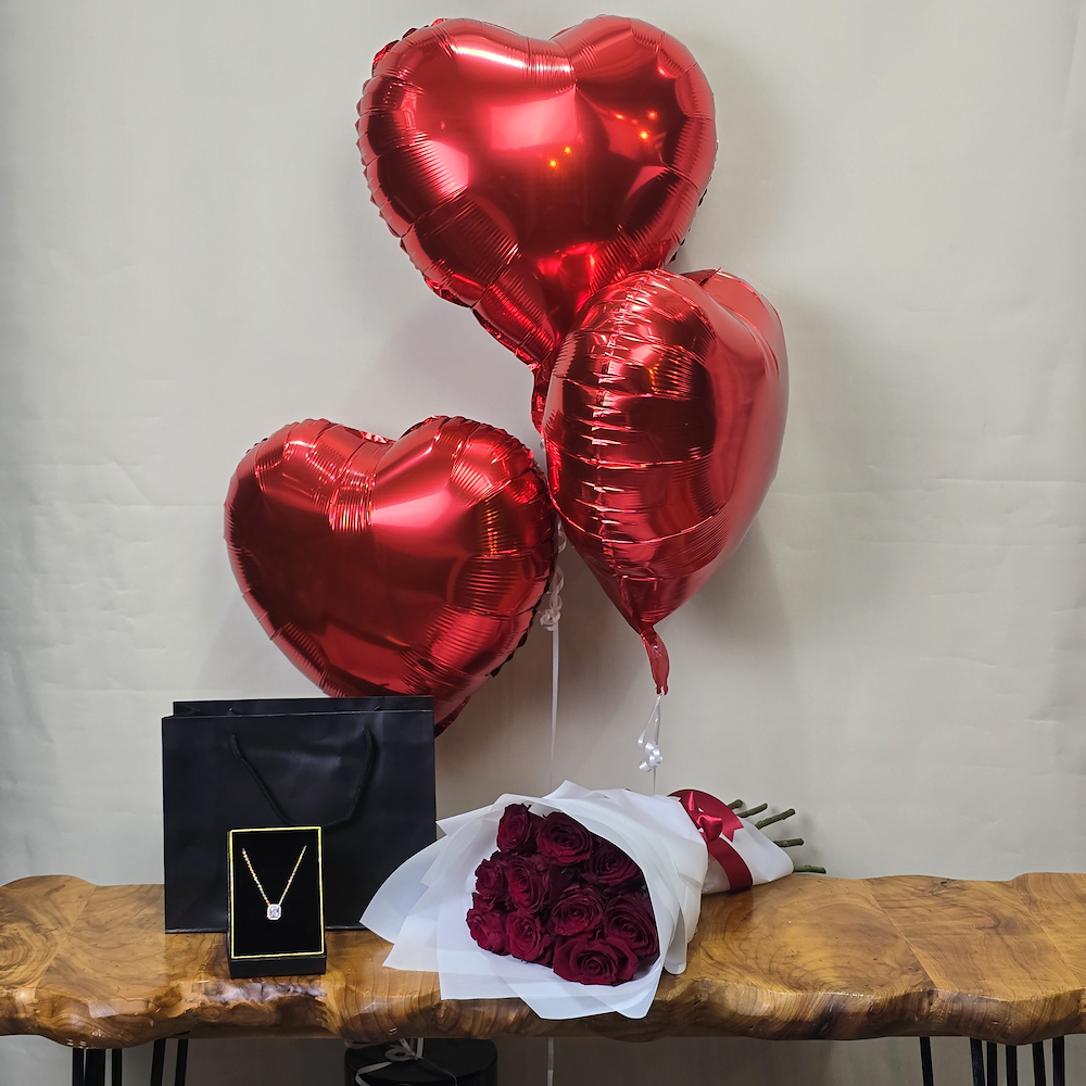 A hand bouquet of red roses with heart-shaped helium balloons and a necklace from Zikoun. The perfect gift to make your loved one happy.