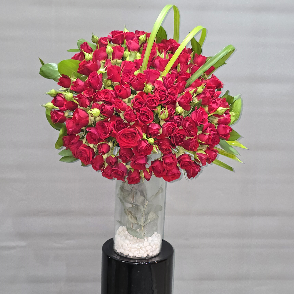 A bouquet containing red baby roses, arranged beautifully in a vase. Perfect for gifting your loved one a beautiful arrangement.