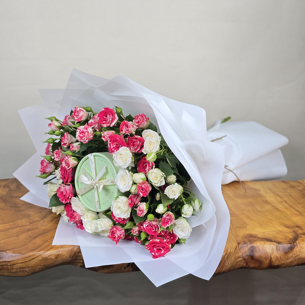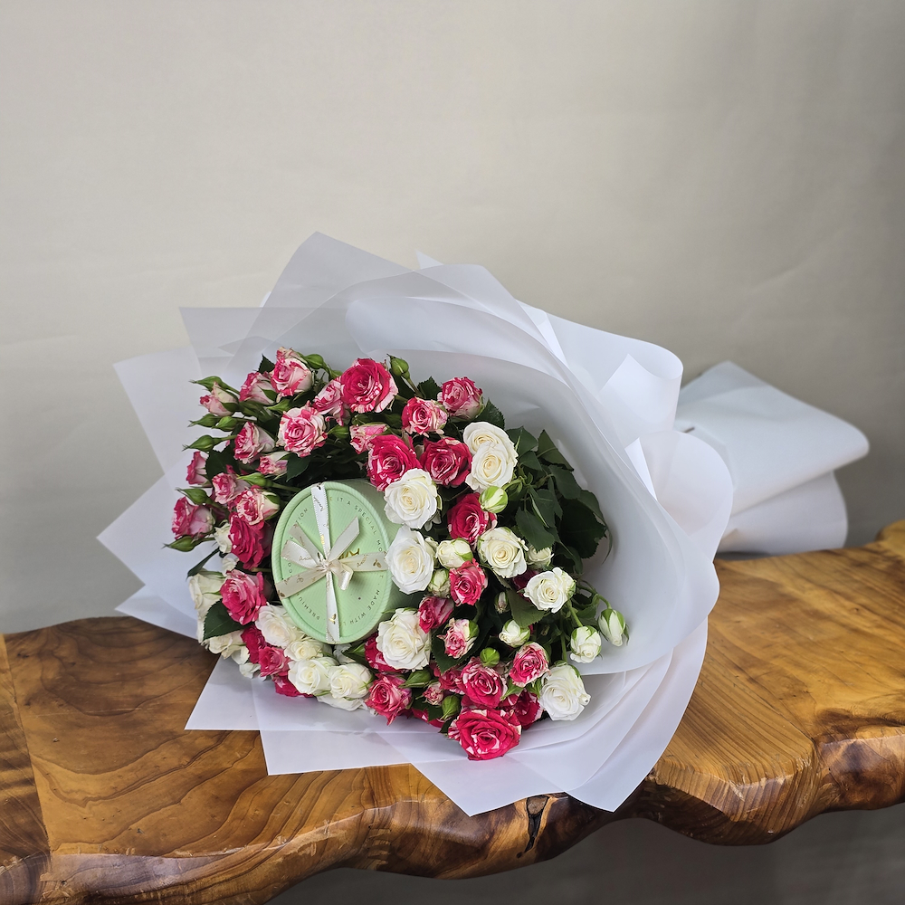 A bouquet of baby roses and small anosh chocolates.