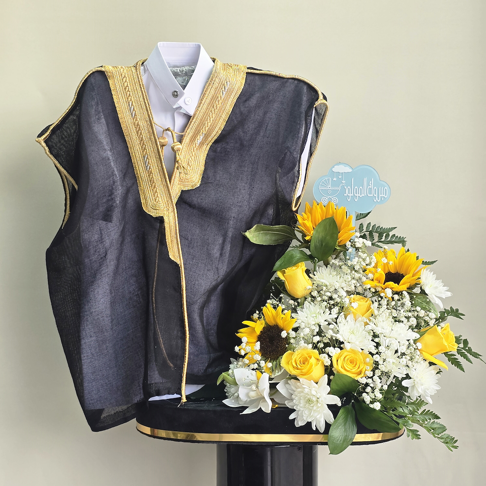 A bouquet containing roses, chrysanthemums, gypsophila, and sunflowers, arranged beautifully in a velvet stand. Comes with a bisht and a Saudi thobe.