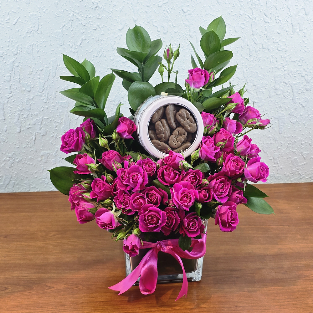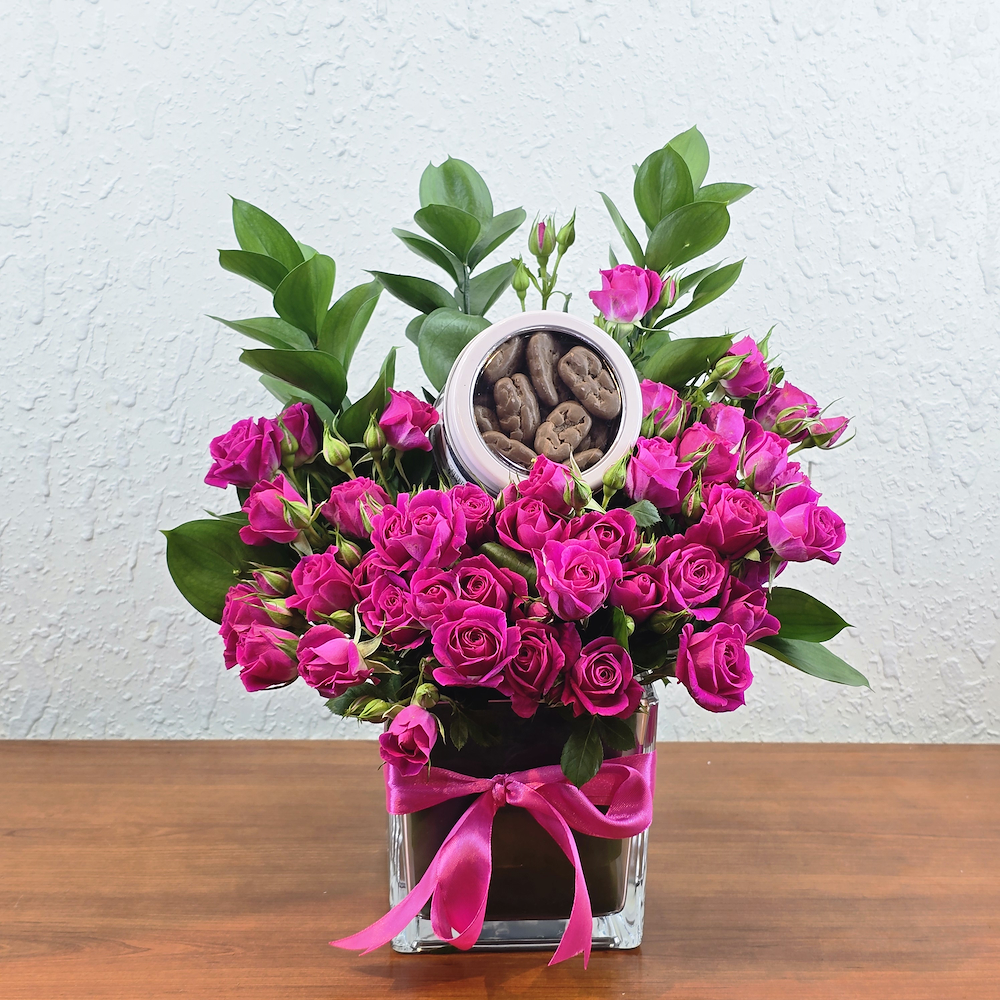 An elegant vase filled with baby roses with Bostani chocolates.