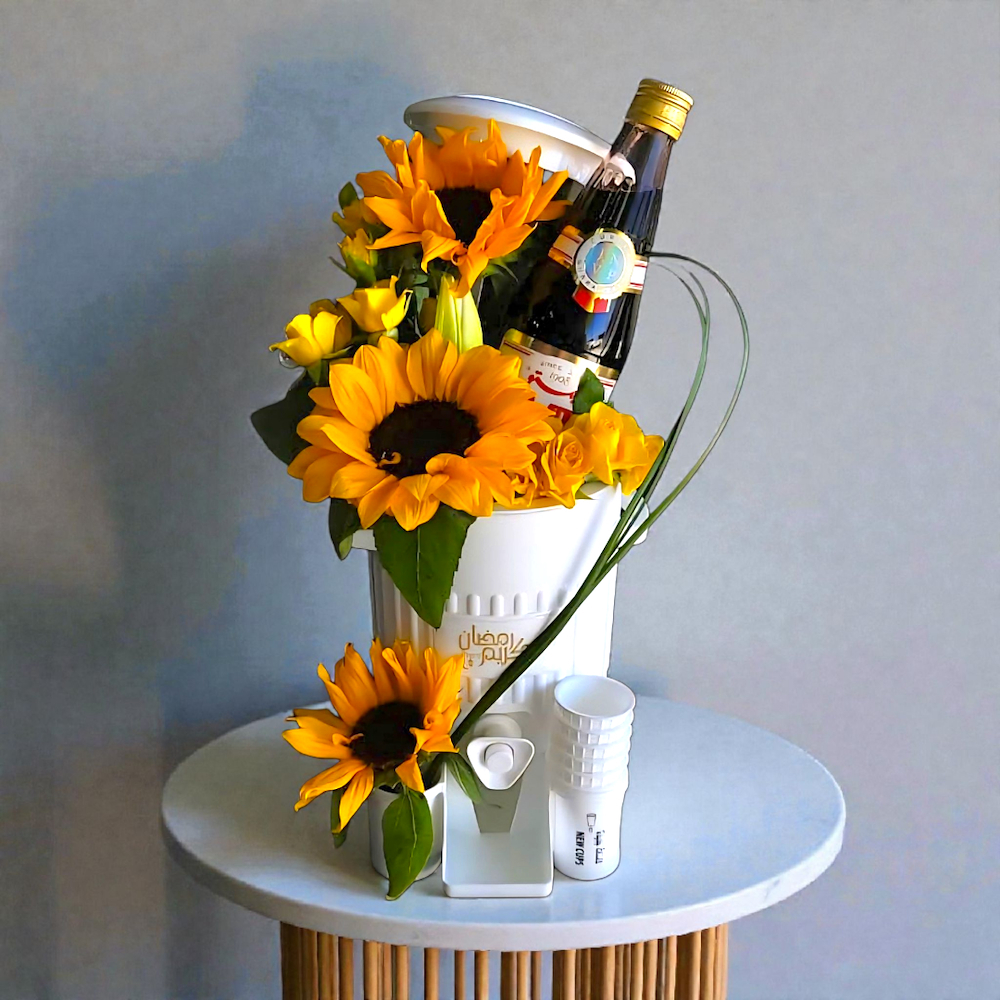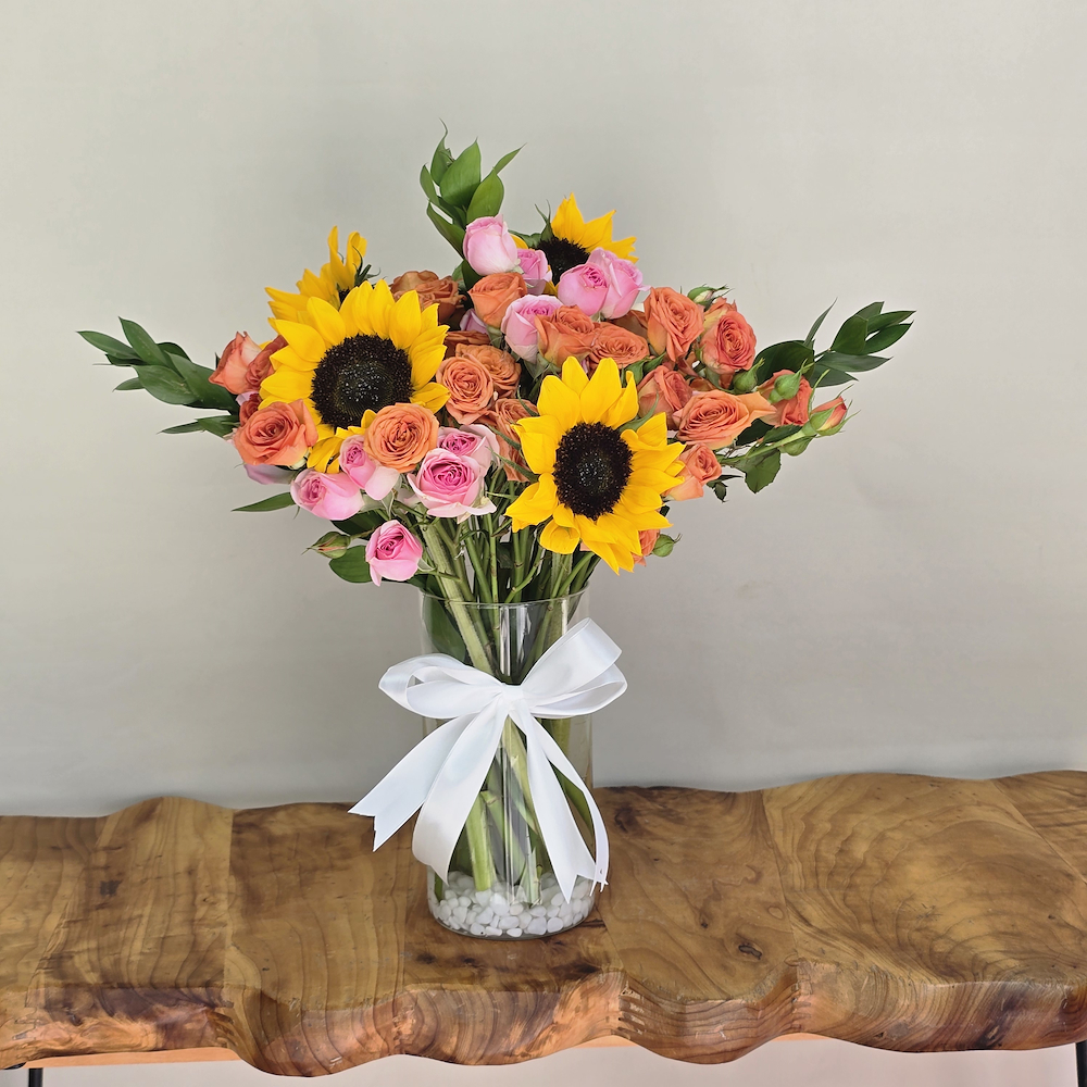 An elegant vase of sunflowers with Dutch baby roses, a gift suitable for all occasions.
