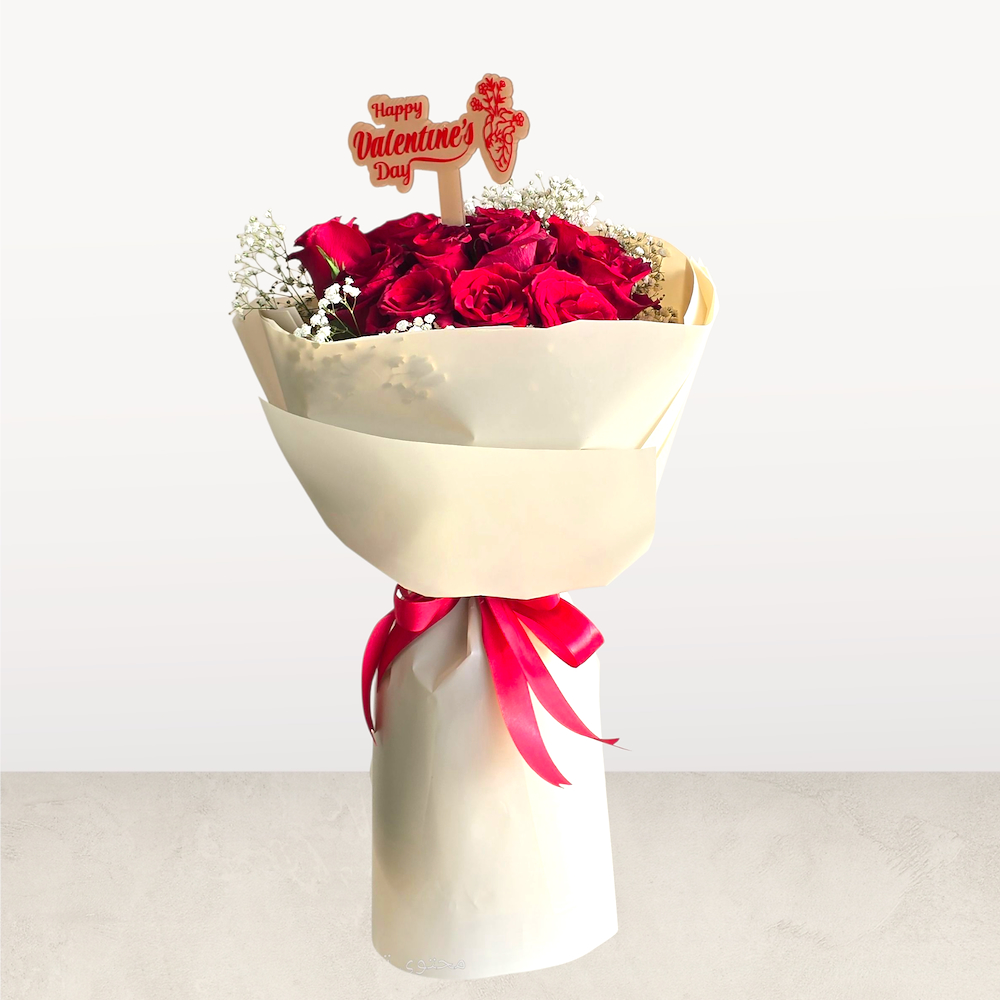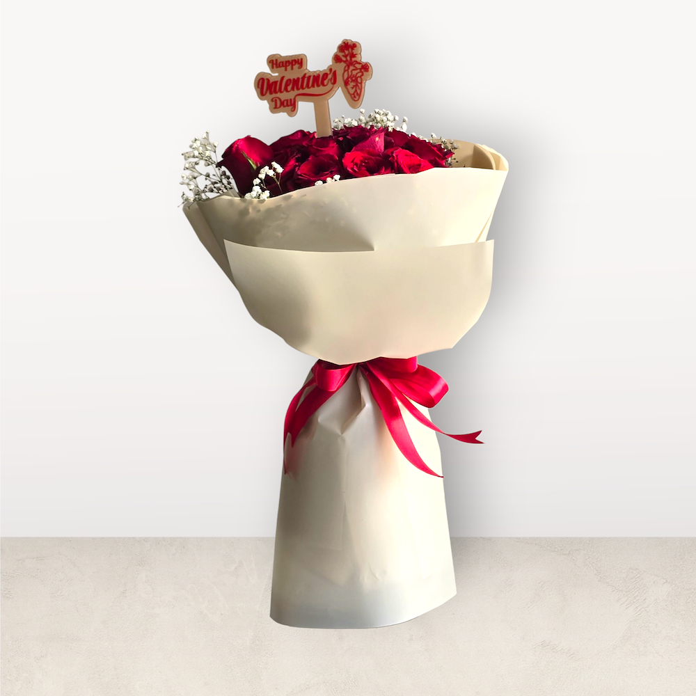 A hand bouquet of roses and gypsophila. A simple yet impactful arrangement to express love in the best way.
