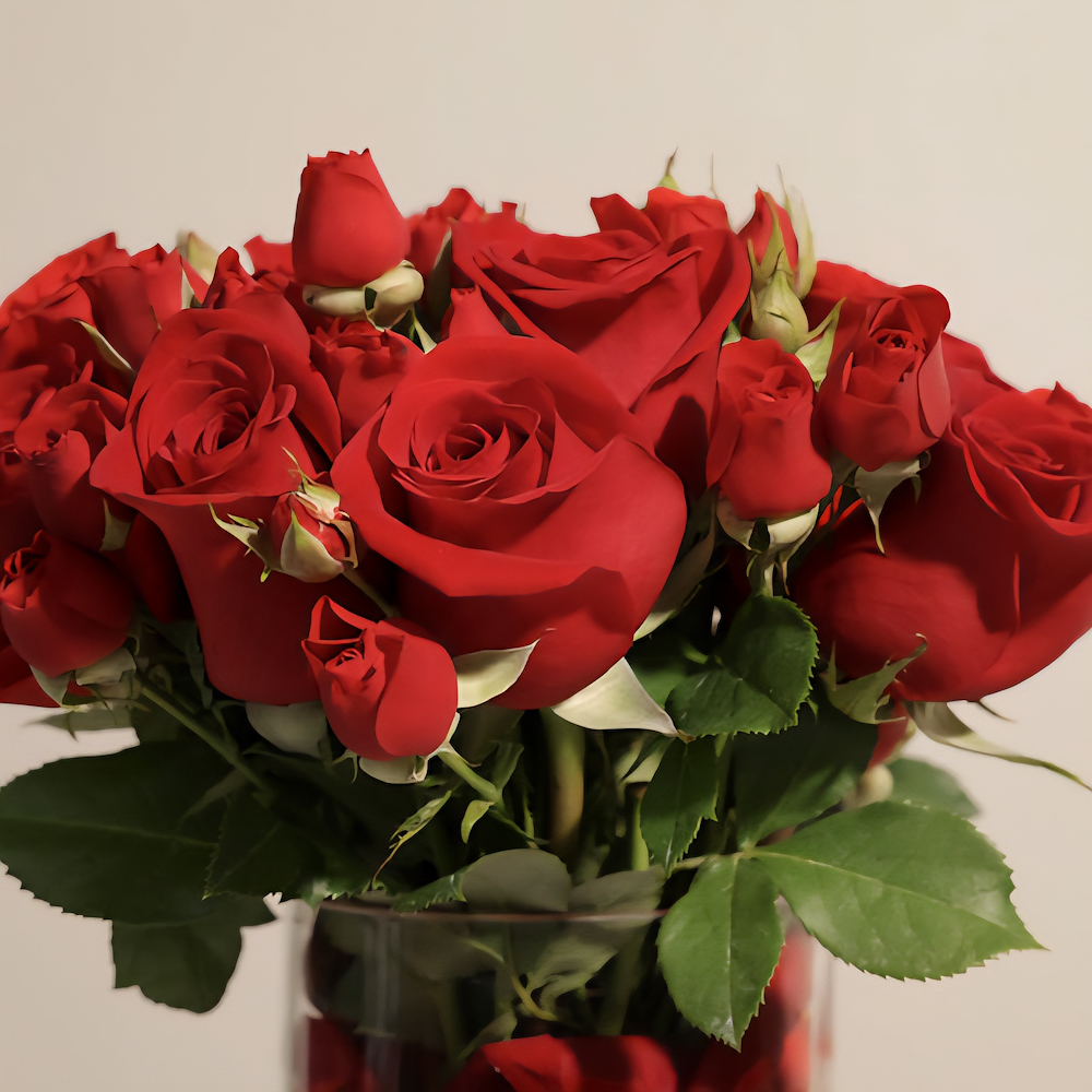 A vase filled with roses and baby roses.