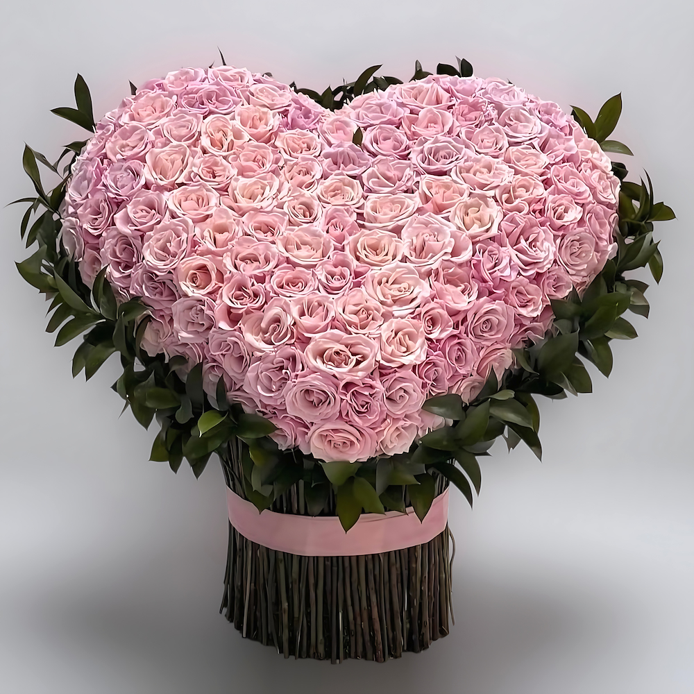 A pink love heart made from over 100 pink roses. You can change the color depending on availability. Contact us through customer service.