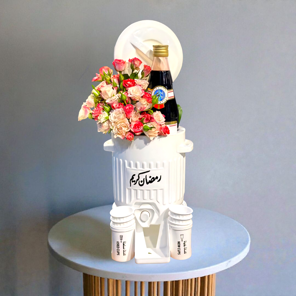 A stylish juice dispenser featuring baby roses with vimto.