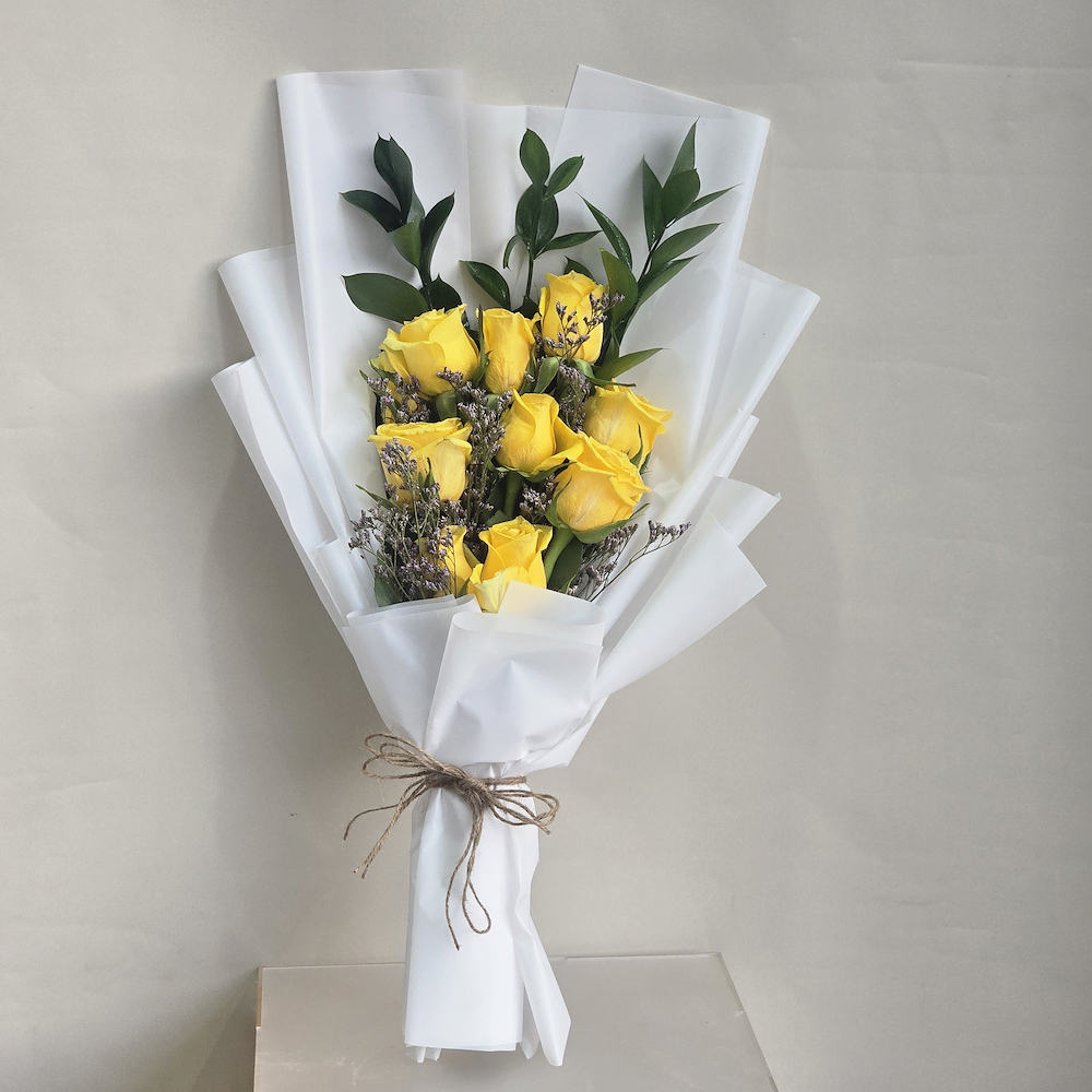 A hand bouquet containing yellow roses, arranged beautifully.