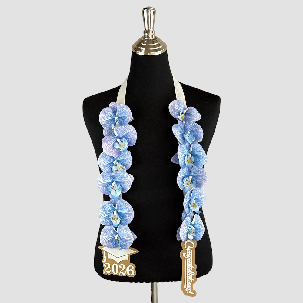 A luxurious graduation sash featuring elegant artificial orchids on a white satin ribbon, adorned with "2026" and congratulations charms. A modern, unique design that adds a regal touch to any graduate's look.